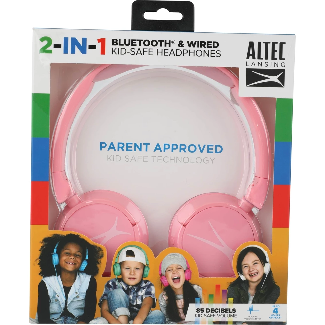 Experience the powerful Altec Lansing sound at a kid’s safe volume. With 85dB of volume limiting technology, your child will be able to listen along to their favorite song or movie at a volume that will not affect their growing ears. With up to 4-hours of battery life, these kid safe headphones will last during your entire road trip or plane ride. Drained battery? No problem, the Altec Lansing Kid’s Friendly Headphones have a wired auxiliary headphone option to extend their listening. Pink. Model: MZX250PNK.