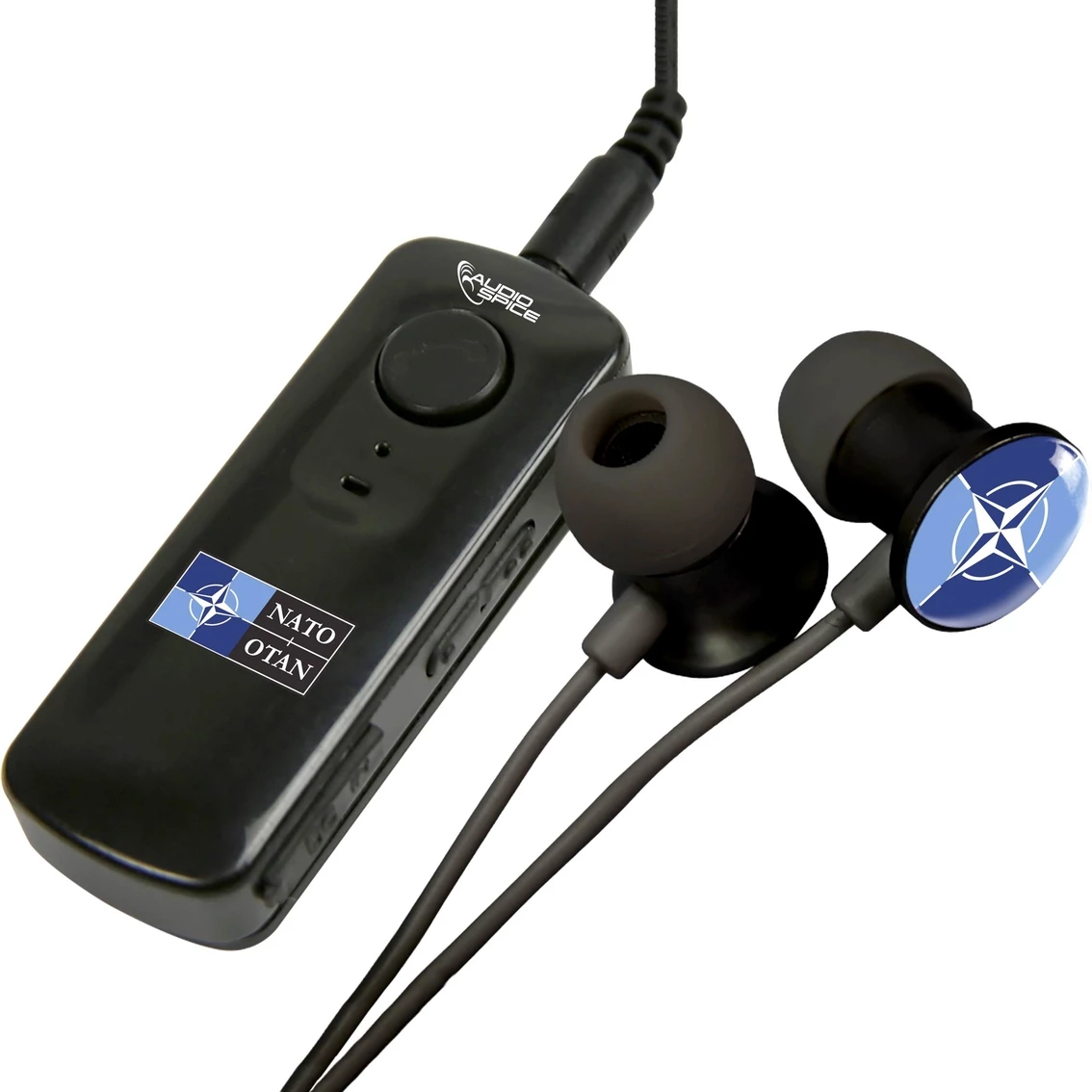 The HR-100 Bluetooth Receiver from AudioSpice turns nearly any wired device into a Bluetooth enabled product. The attached clip is easily used for a hands-free experience. Simply plug the earbuds, headphones or other device into the 3.5mm jack and connect to your device via Bluetooth wireless technology. NATO logos are prominently displayed. Model: CG9G50.