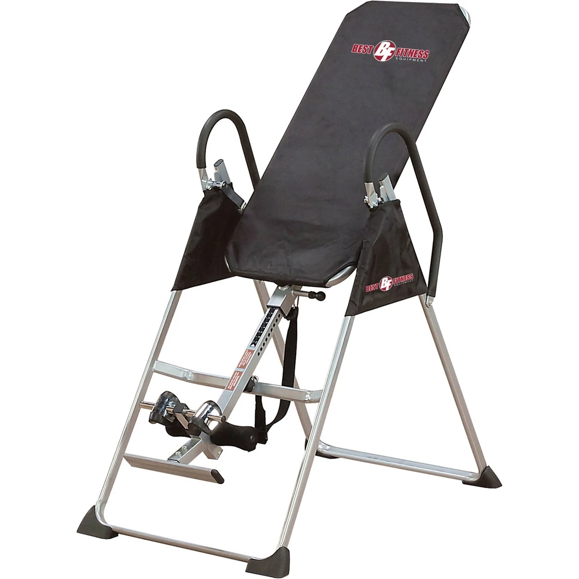 The Best Fitness BFINVER10 Inversion Table is designed to relieve stress, reduce back pain, increase flexibility and improve your posture by suspending your body’s weight in a comfortable, controllable motion. A strong, stable base supports a comfortably padded, nylon backboard. The BFINVER10 features a spring-loaded, safety strap to ensure stability during inversion. A graduated scale on the extension bar allows simple, fast adjustments to accommodate users up to 6 ft., 6 in. tall. For additional comfort, adjustable ankle cuffs provide a custom fit that cannot be achieved with foam rollers common to many inversion tables. Best of all, you can simply pull two pins on the BFINVER10 to collapse and fold it away into any closet. The Best Fitness BFINVER10 Inversion Table is designed to take advantage of the downward force of gravity to relieve pressure in your back. In one smooth, fluid move, you can safely go from an upright position to completely inverted. Just adjust the unit to accommodate your height and strap the ankle cuffs to secure a safe, comfortable fit. Then, lean back and enjoy the many benefits of inversion therapy, including less back and neck pain, fewer headaches, better posture, improved blood flow and less stress. Explore a new perspective on back pain and spinal decompression with the Best Fitness BFINVER10 Inversion Table. Model: BFINVER10.