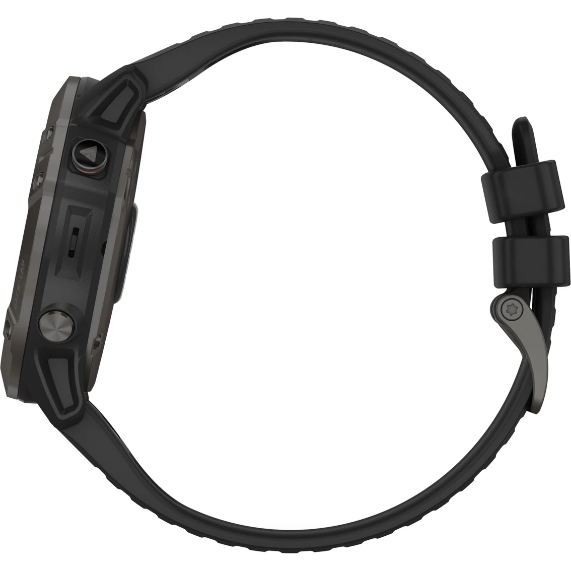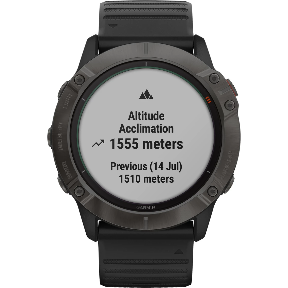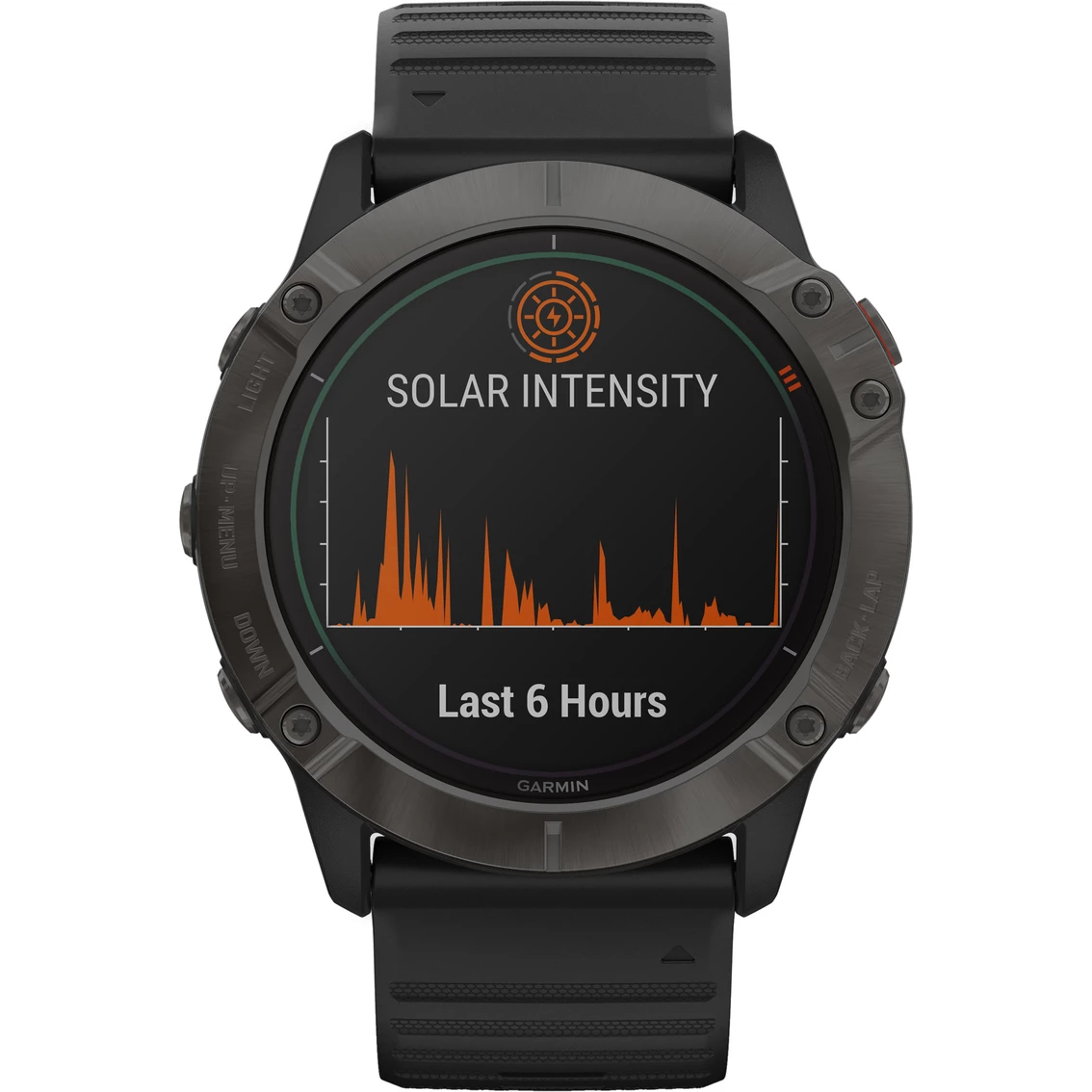 Garmin’s Solar-powered multisport GPS watch with large 1.4-in. display (36% larger than previous fenix models) uses the sun’s energy to extend battery life and assure more on-wrist time for your off-grid activities. It features enhanced wrist heart rate and Pulse Ox sensing of blood oxygen saturation to support advanced sleep monitoring and altitude acclimation at high elevations. Advanced training features include PacePro for grade-adjusted pace guidance throughout your activity plus environmentally adjusted VO2 max and training status estimates. Navigate the outdoors with preloaded TOPO maps, ski maps for over 2,000 worldwide ski resorts, multiple global navigation satellite system (GPS, GLONASS and Galileo) support and built-in sensors for 3-axis compass, gyroscope and barometric altimeter. Support for Garmin Pay contactless payments5, music storage with premium streaming service support, smart notifications and more. Battery performance up to 30 days in smartwatch mode, up to 20 hours in GPS mode with music and up to 120 hours in UltraTrac battery saver mode. Customizable power manager modes let you see and control how various settings and sensors impact battery life. Model: 010-02157-20.