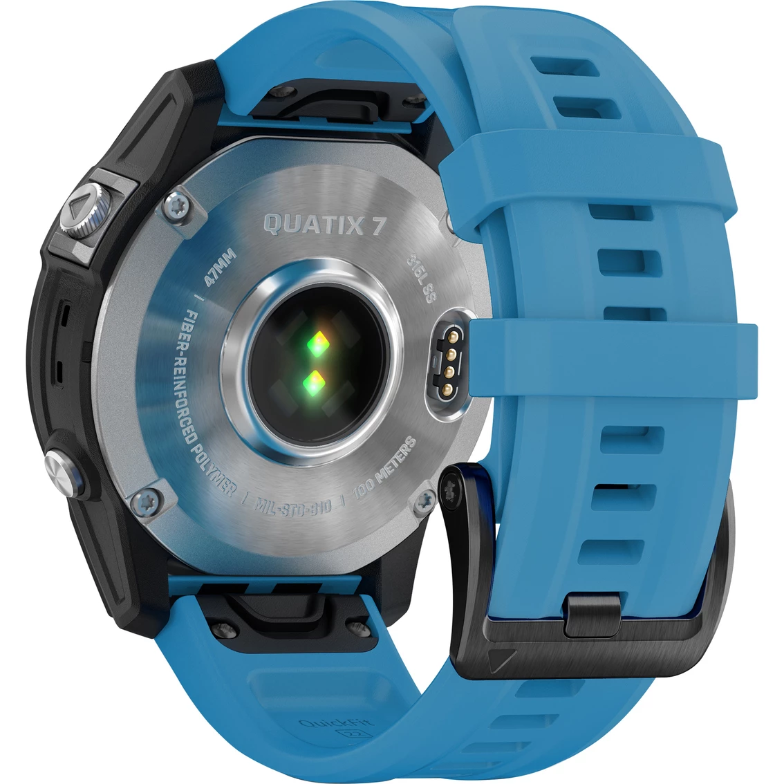 Plot your paradise on the water and beyond with the Garmin quatix 7, the multisport GPS smartwatch that has all the features you need on your boat and the ones you want off it. The quatix 7 provides comprehensive connectivity with compatible Garmin chartplotters and other compatible marine devices to offer autopilot control, data streaming, Fusion-Link entertainment system control, integrated tide data on the watch face, new alarms for better situational awareness and much more. Use traditional button controls or the new touchscreen interface to access selections. This smartwatch supports optional BlueChart g3 coastal charts and LakeVu g3 inland maps. When paired with your compatible smartphone, enjoy advanced smartwatch features for all-day wearability include built-in activity profiles for water and land sports, performance metrics, smart notifications, 24/7 health monitoring, access to the Garmin Connect app and Garmin Pay contactless payments (with a supported country and payment network). Model: 010-02540-60.
