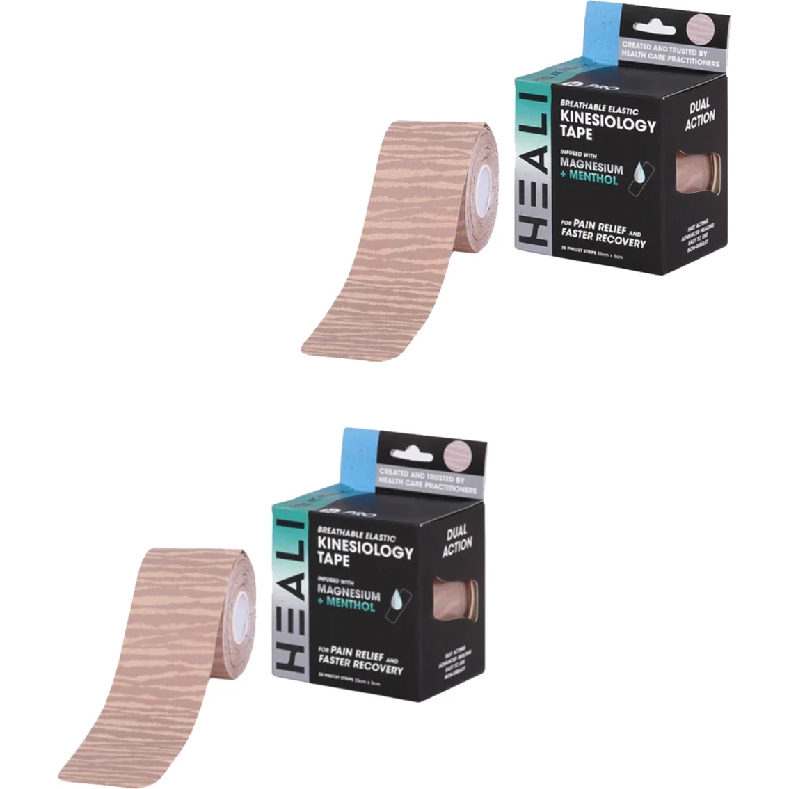 Heali PRO Kinesiology Tape is infused with magnesium and menthol directly on the tape for faster recovery and pain relief. Heali PRO Tape is made with soft and breathable synthetic silk and is latex free. The strong (sticky) adhesive lasts for 4-7 days.