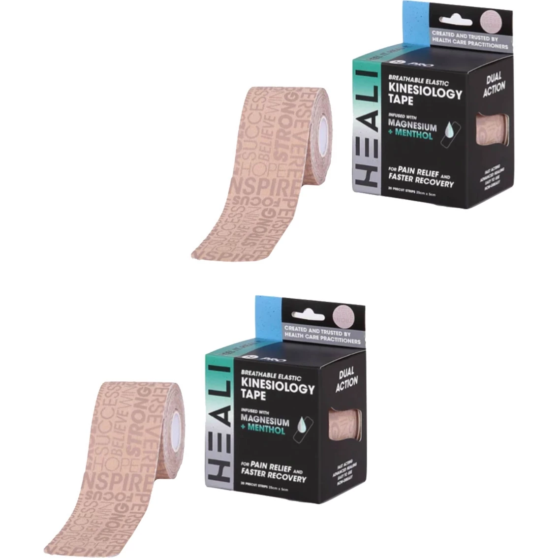 Heali Kinesiology Tape is infused with Magnesium and Menthol directly on the tape for faster recovery and pain relief. Heali PRO Tape is made with soft and breathable synthetic silk and is latex free. The strong (sticky) adhesive lasts for 4-7 days. Quality you can trust, Heali PRO is created and trusted by healthcare practitioners. Heali PRO Kinesiology Tape provides stability, supports muscles and joints and reduces tissue pressure. In addition, it is the first tape on the market infused directly with Magnesium and Menthol providing extra benefits to help with Pain Relief, Faster Recovery and so much more. Heali Tape PRO has a mild, non-offensive scent and is safe for ages 12 and over. Two pack, each contain 20 precut strips of pro kinesiology tape.