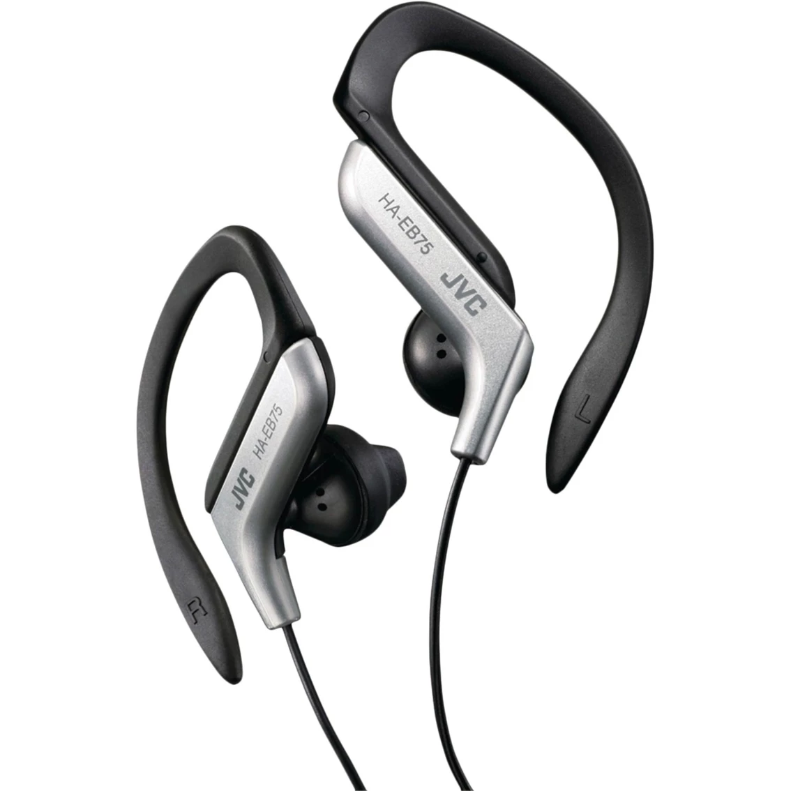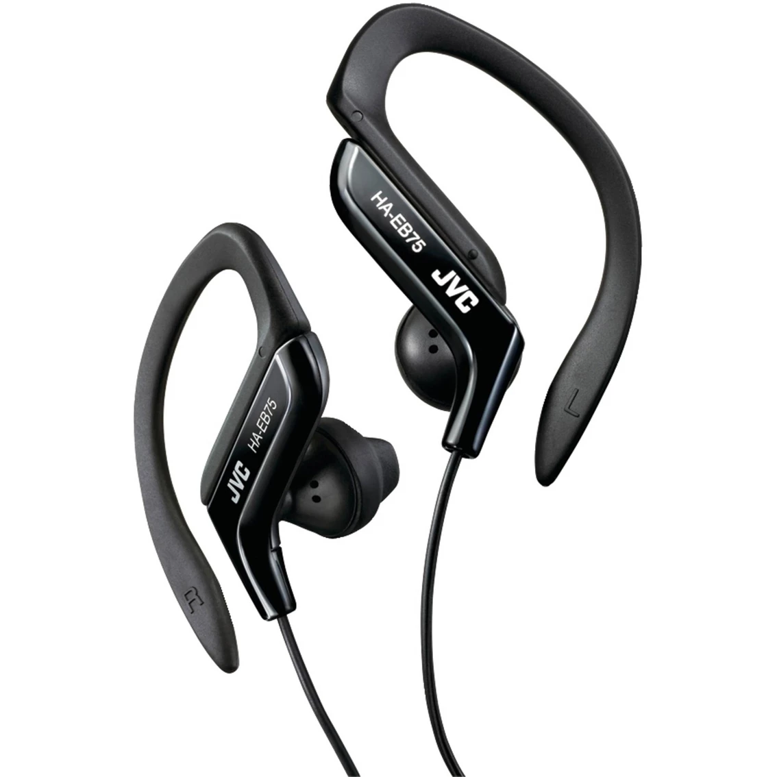 Designed for sports and other active use, the affordable JVC HA-EB75 splash-proof headphones incorporate a soft rubber ear clip that fits around the outer ear to hold the earbud in place. To ensure a comfortable and secure fit, the ear clip is adjustable, with a slide mechanism that offers five different positions to adjust to different size ears. To ensure high quality sound reproduction, a 0.53 in. (13.5mm) neodymium driver in each earpiece provides powerful sound with bass boost earpieces to deliver rich audio quality. Also, the water-resistant design helps protect the headphones from the elements. The headphones come with a 4-ft. (1.2m) friction noise reduction cord and an iPhone-compatible plug. Model: JVCHAEB75B.