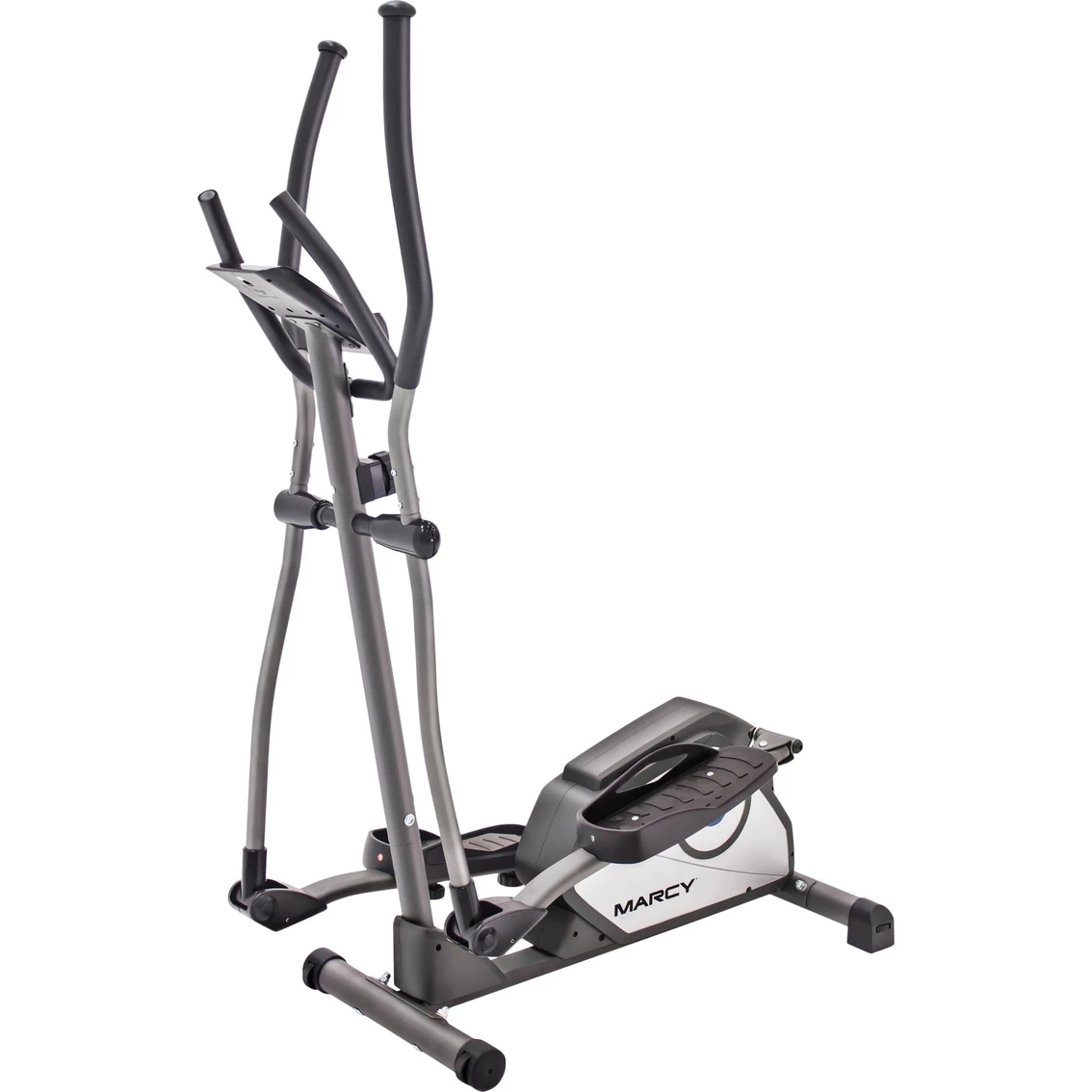 Get a gym quality cardio workout in the comfort of your own home with the Marcy NS-40501E Elliptical Trainer. Oversized pedals keep your feet properly secured while vinyl-covered foam handles offer ergonomic grip for a safe and comfortable workout. The Marcy Elliptical Trainer features eight preset magnetic resistance levels for a customizable workout as well as an easy-to-read LCD console that offers time, speed, distance, calories, odometer and scan-through viewing options. The Marcy Elliptical Trainer is built to last with powder-coated, heavy-duty steel construction, and a small footprint design along with convenient transport wheels make this home gym equipment unit highly compact and easily movable. 2-year limited warranty.
