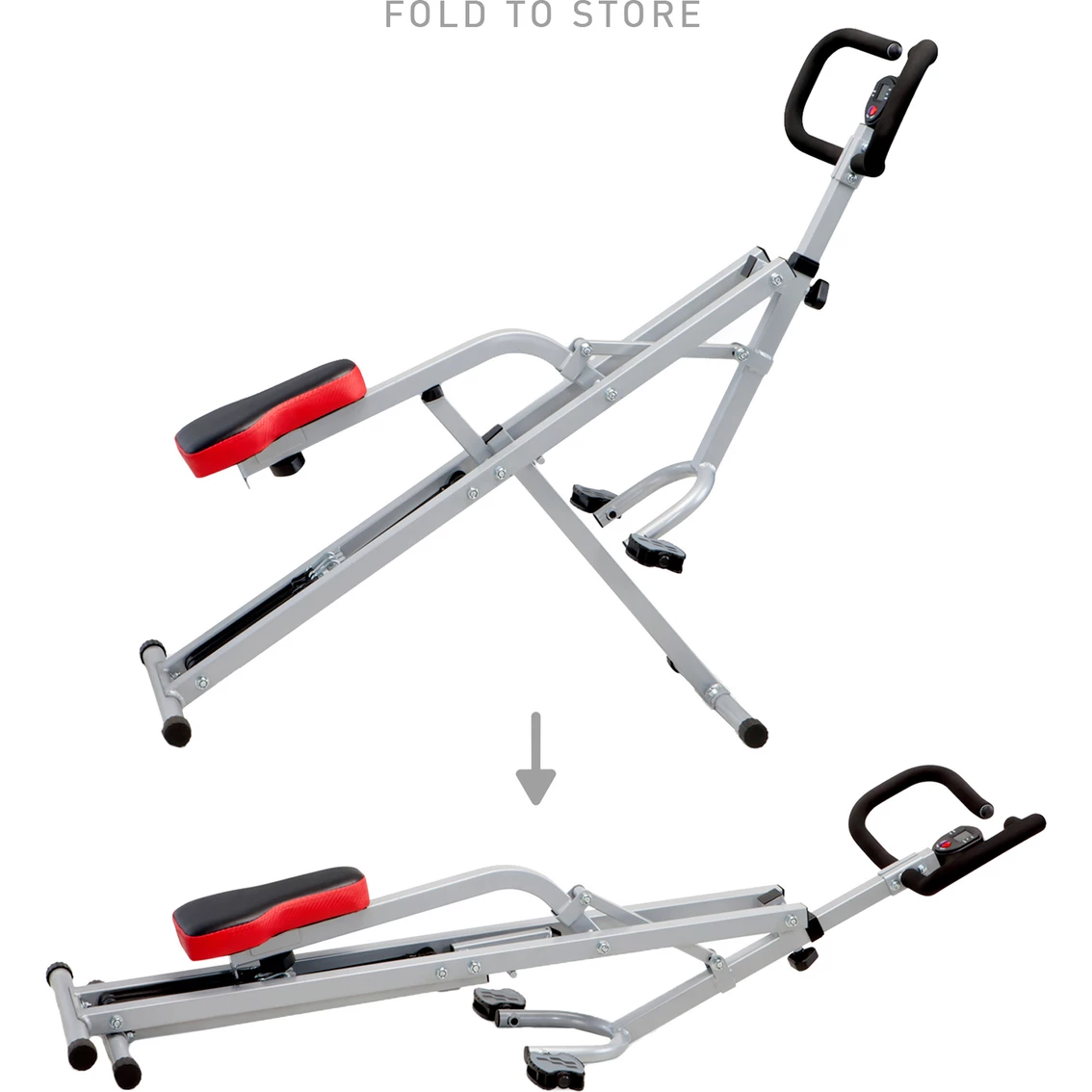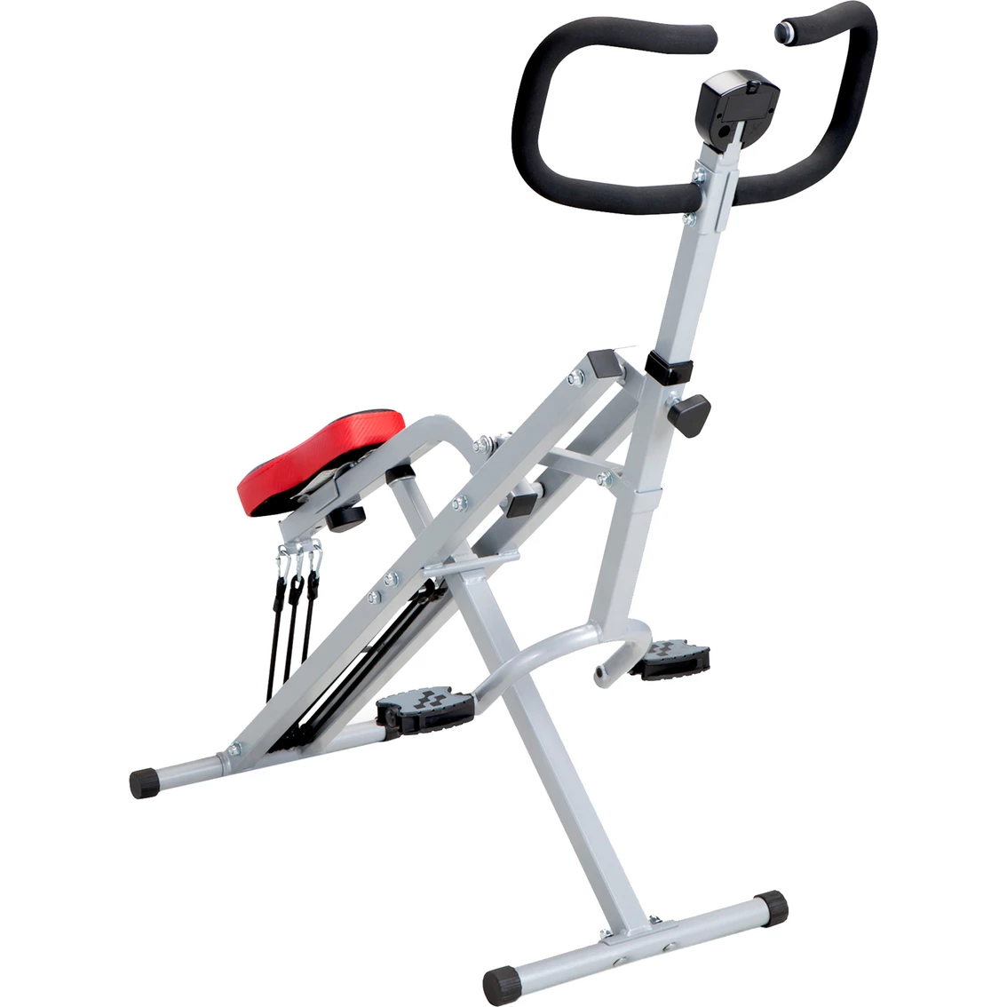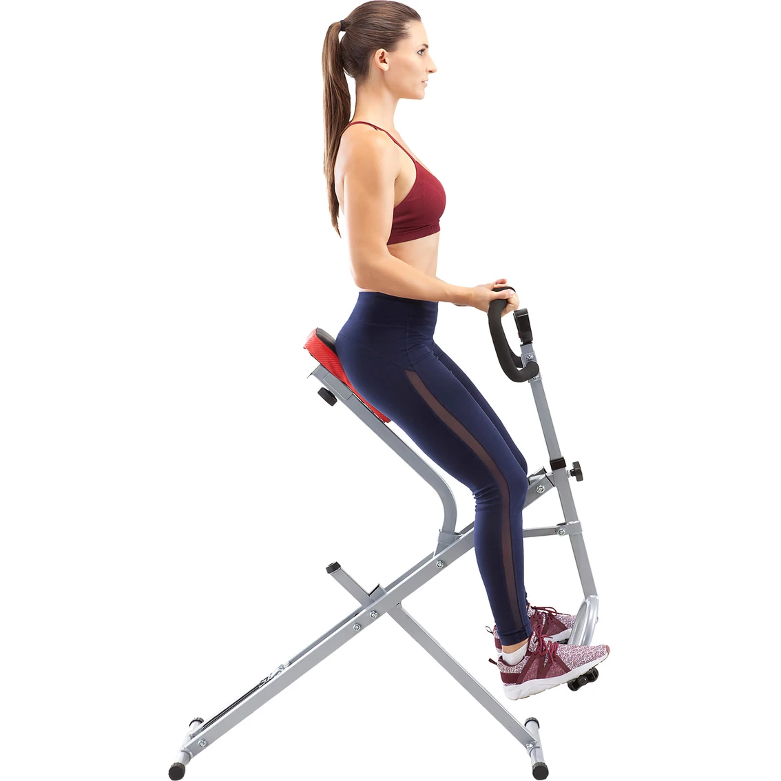 The Marcy Squat Rider Machine is a light and compact squat machine that does not require weights. The Squat Rider Machine uses three resistance bands under the seat to provide resistance during your squats. To add resistance, simply hook the bands under the seat and to drop resistance, unhook the bands as necessary. As opposed to free form squats with or without weights, the handle on the Squat Rider Machine ensures proper form while squatting. In addition, using the handle provides a slight workout for your arms while squatting. The included computer tracks count, time and calories to help you measure progress. The seat and handle can be adjusted to fit your needs. For added convenience, the Squat Rider folds when not in use so you can easily store the unit. Model: XJ-6334.