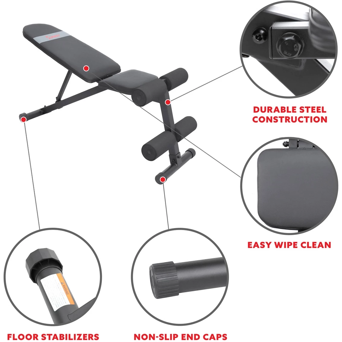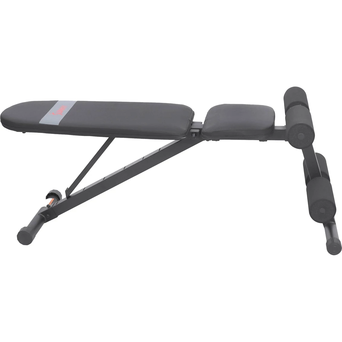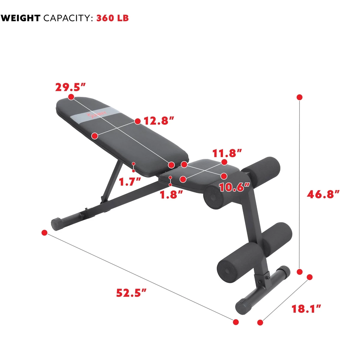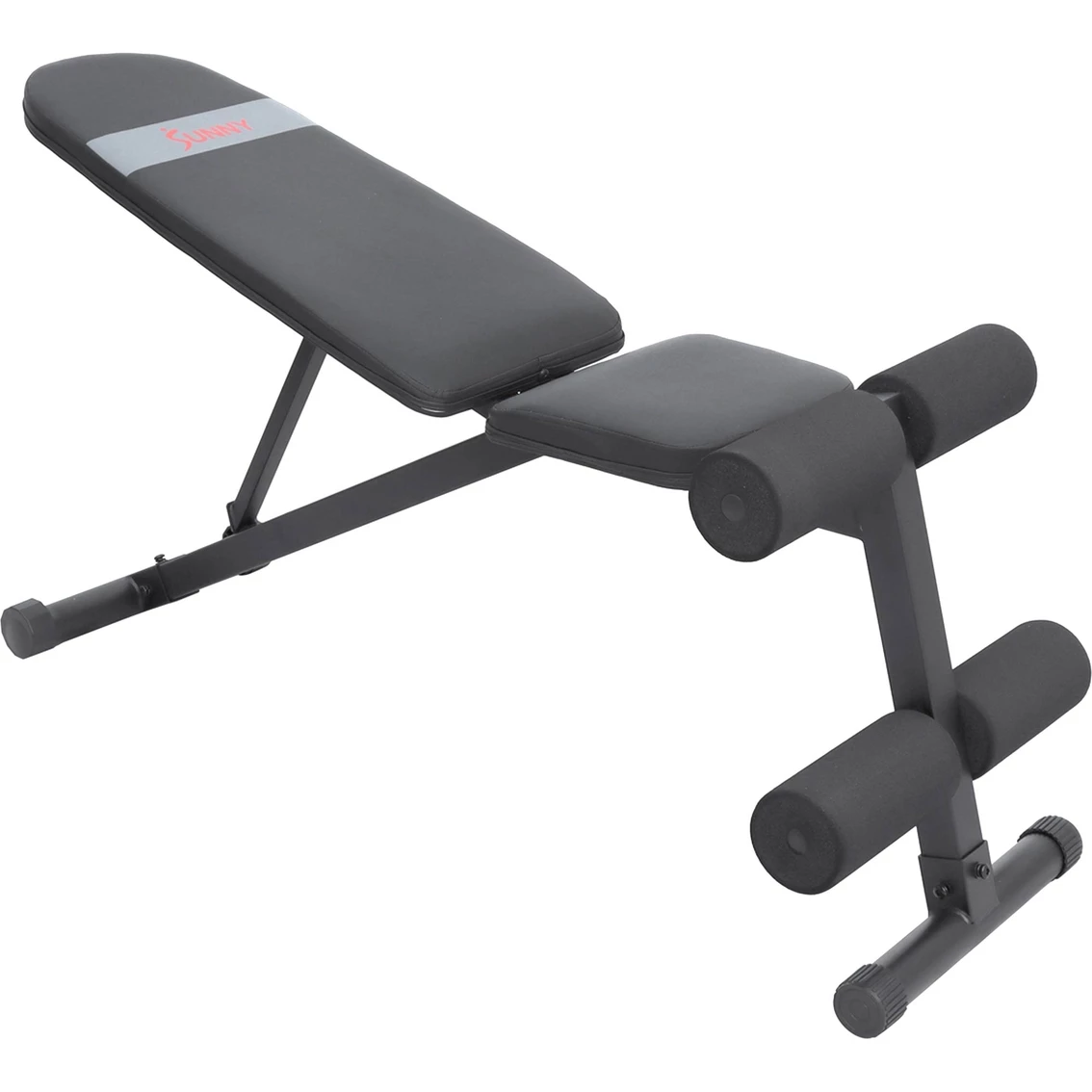 Adjustable weight benches are the cornerstone of any strength training home gym. The Sunny Health and Fitness Adjustable Recline and Decline Weight Bench is the ultimate in value, versatility and usability. Designed and constructed with high-strength steel, it can hold a maximum weight capacity of 360 lb. The extra-large backrest offers superior comfort and padding as well as support so you can focus on making those gains. Add variation to your dumbbell, kettlebell and other weight lifting exercise by utilizing the 7 levels adjustable backrest. The backrest measures nearly 13 in. wide for added support on larger body shapes and sizes. The adjustable back has a wide range of settings that ranges from -15รยฐ, 0รยฐ, 15รยฐ, 30รยฐ, 45รยฐ, 60รยฐ and 80รยฐ. High density foam padding on the seat and back support alleviates aches and pain from long sessions working out on the weight bench. Model: SF-BH620038.