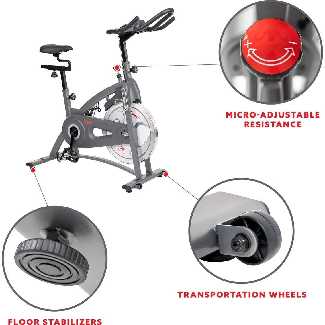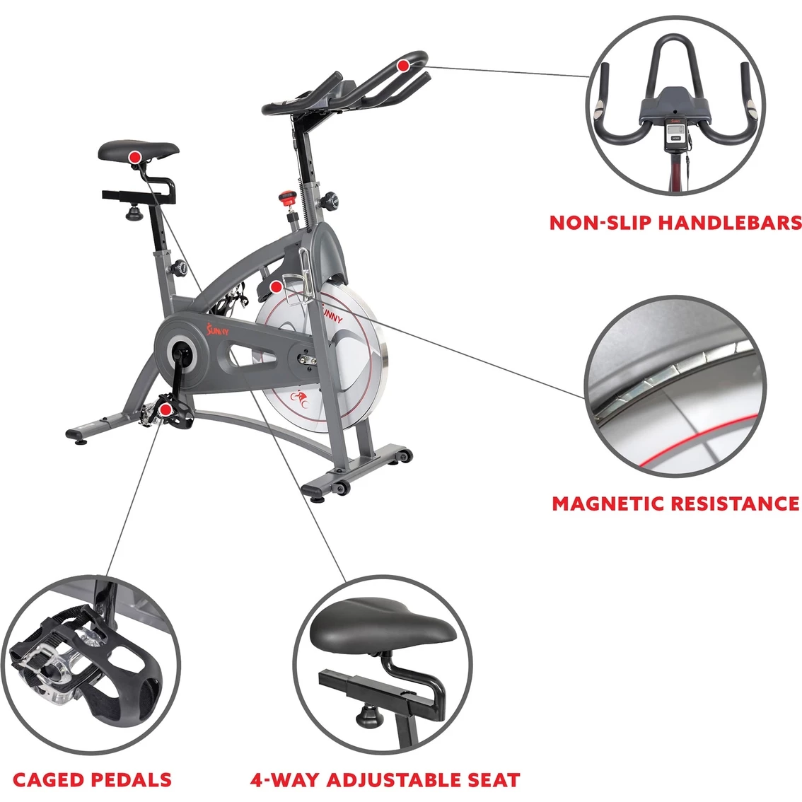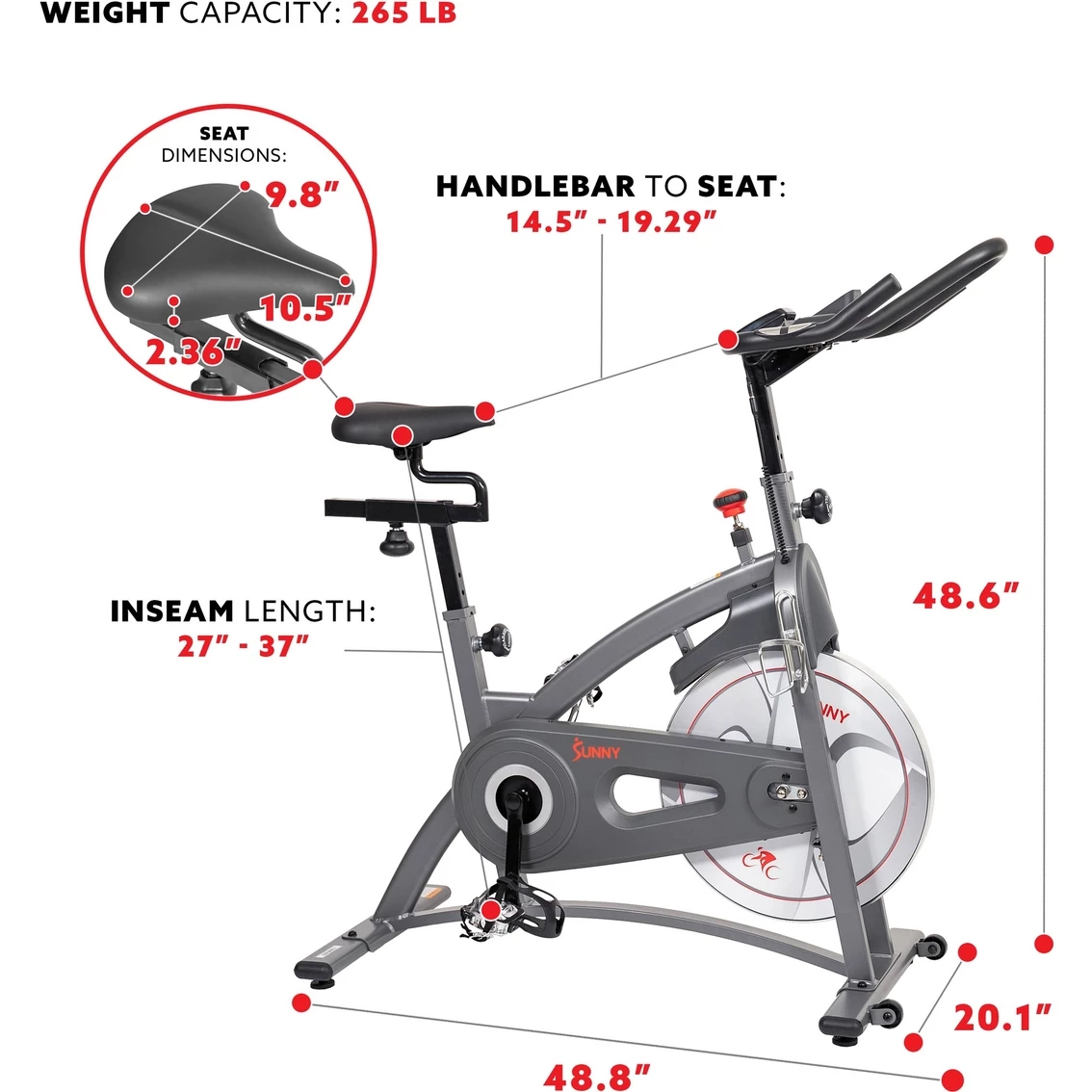 The Endurance Magnetic Indoor Exercise Cycle Bike from Sunny Health and Fitness is an excellent belt-driven system model for low-impact fitness. The performance monitor allows you to track your Time, Speed, Distance, Calorie, Odometer, RPM and Pulse. Excellent for beginners and enthusiasts in fitness or anyone needing recovery training to start an in-home calorie-burning workout routine. Adjustable magnetic resistance allows you to change up your exercise cycling routine making every home workout session feel different. Designed to last, feel confident riding this durable stationary bike with a 265 lb. maximum user weight. The Endurance Magnetic Exercise Bike will push your stamina, performance and fitness to the next level! Model: SF-B1877.