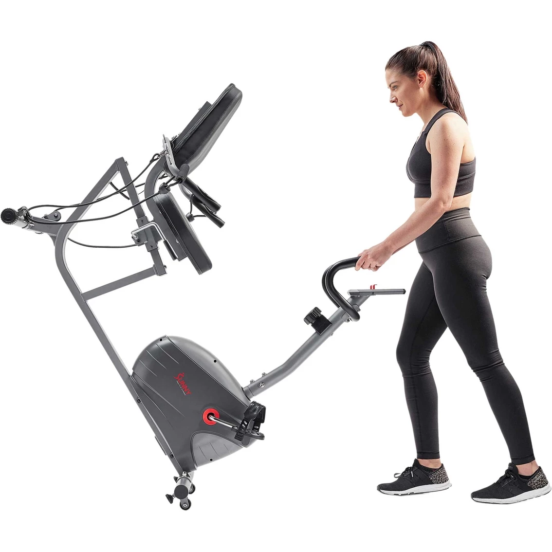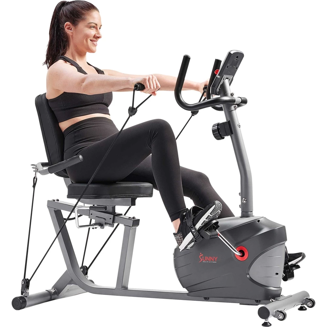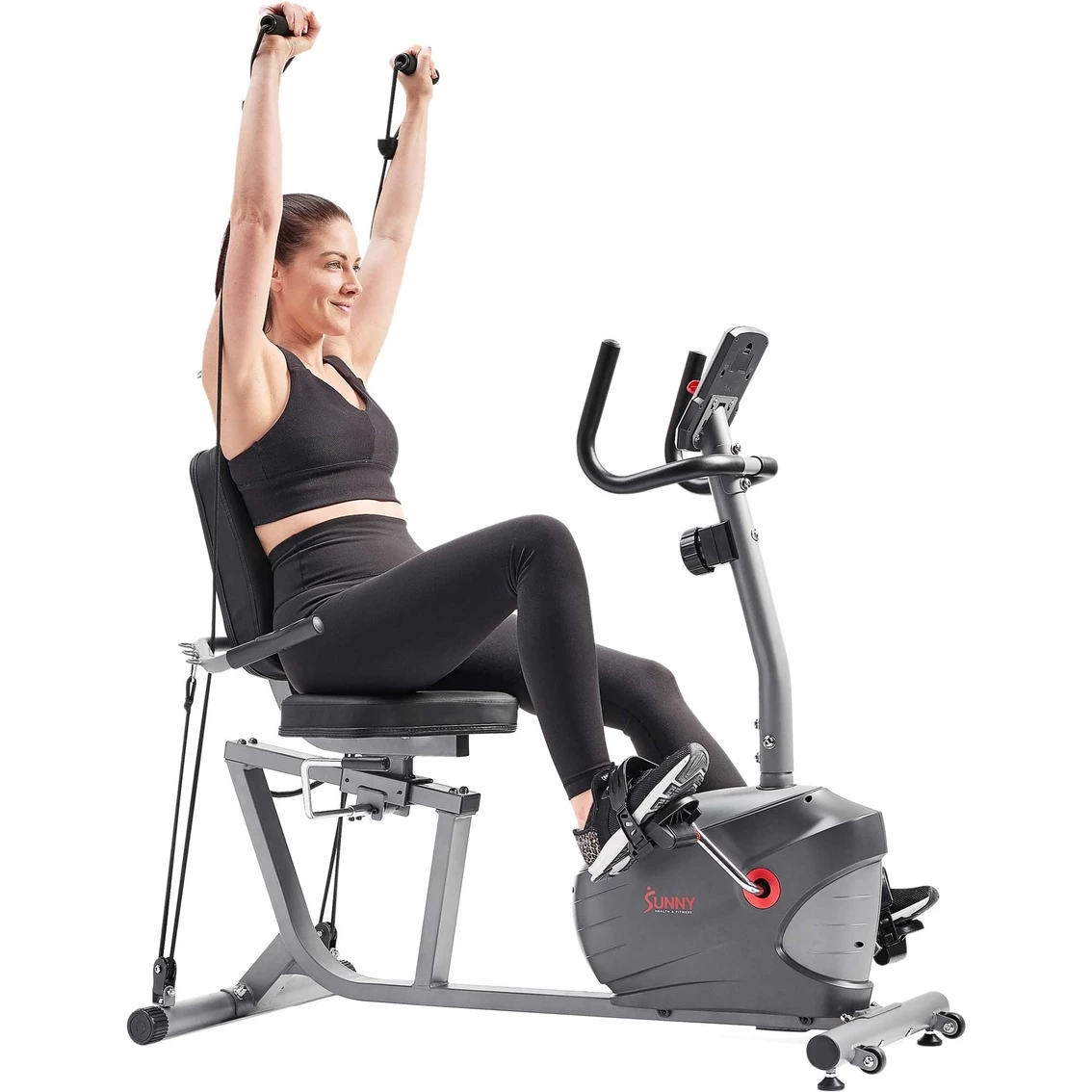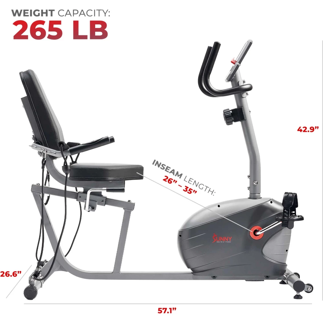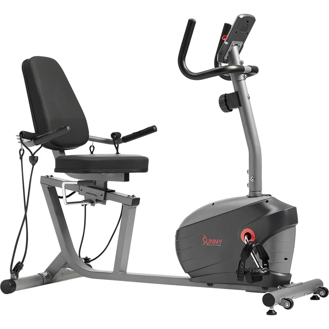 The perfect balance of performance, value, comfort, technology and convenience has arrived with the Sunny Health and Fitness Performance Interactive Series Recumbent Exercise Bike. Get even more connected with your fitness with the SunnyFit APP available on Google Play, or the Apple App Store. Incorporate resistance bands into your cardio biking sessions to add a whole new level of fitness. Whether you’re a senior looking to maintain an active lifestyle, too busy to get to the gym, or just enjoy working out in the comfort of your own home, the Sunny Health and Fitness Performance Interactive Series Recumbent Exercise Bike is a fit for everyone. Pedal along with Sunny Health and Fitness expert trainers on the Sunny Health and Fitness SunnyFit APP Connect your preferred mobile device through Bluetooth and view your performance metrics in real-time. The all-new SunnyFit APP takes your Sunny workouts to the next level! View your live metrics displayed in real-time as you tour the world with real location maps. Get the results you want with customized workout plans. Explore 100+ workout videos that fit your schedule and goals. Compare your results on the exercise bike leaderboard, share your fitness experiences, get workout tips and much more! If the monitor is not connected to the SunnyFit App, it will display fitness metrics in real-time: Time, Speed, Distance, Calories, Odometer, Pulse, Scan. Included resistance bands adds a new dimension to your recumbent exercise bike routine by incorporating an upper-body training component into your workouts. 3 separate placement hooks allow for positional adjustment for your body or exercise lesson. Lift and swing the handlebars if focusing just on your lower body. Sunny is not only committed to the improvement and development of a healthy lifestyle of fitness enthusiasts but also to their environment. This recumbent stationary exercise bike is packaged with the latest in recyclable, sustainable, and biodegradable materials while maintaining its protective structural integrity. Fully ISTA-6 certified to meet the most stringent durability standards. Model: SF-RB420031.