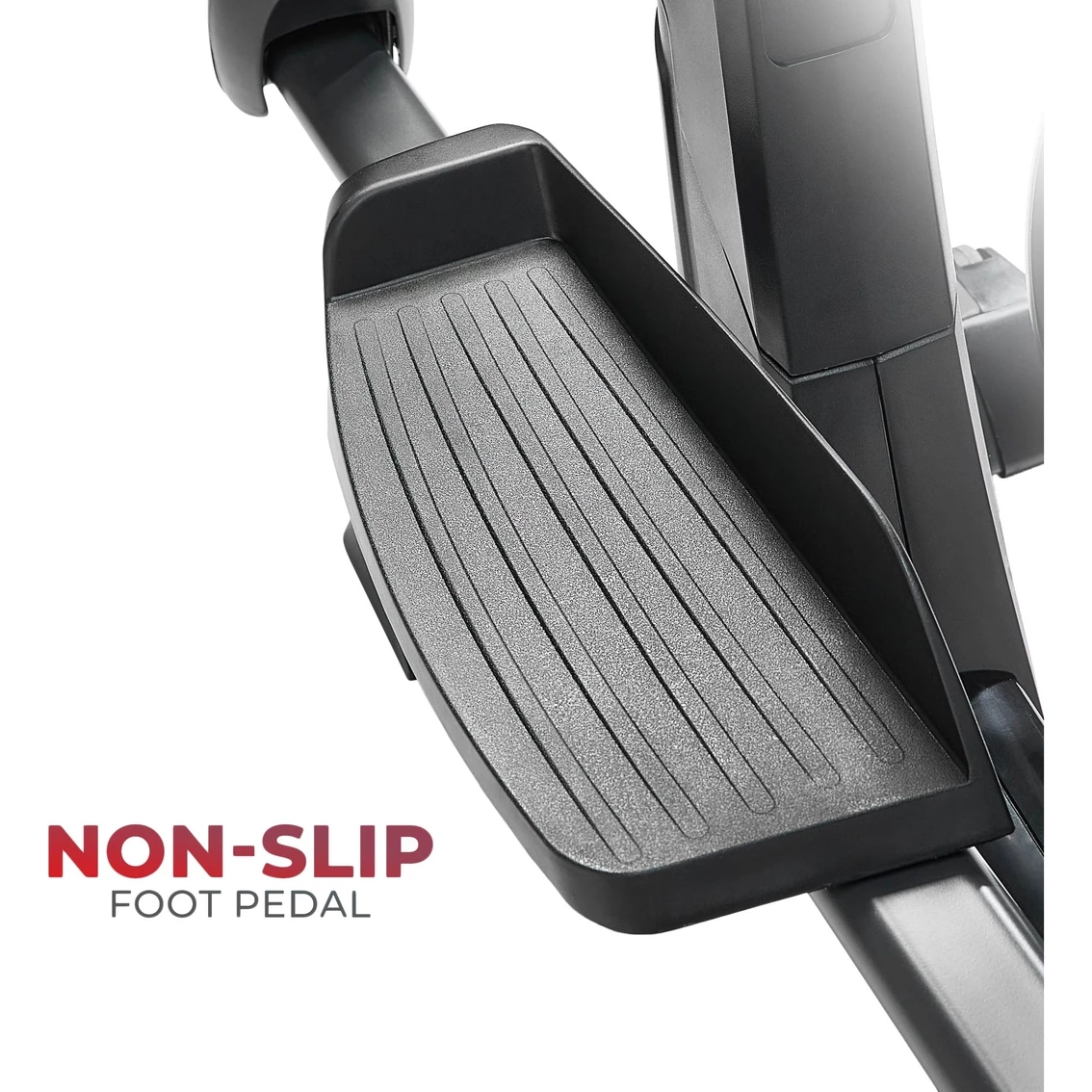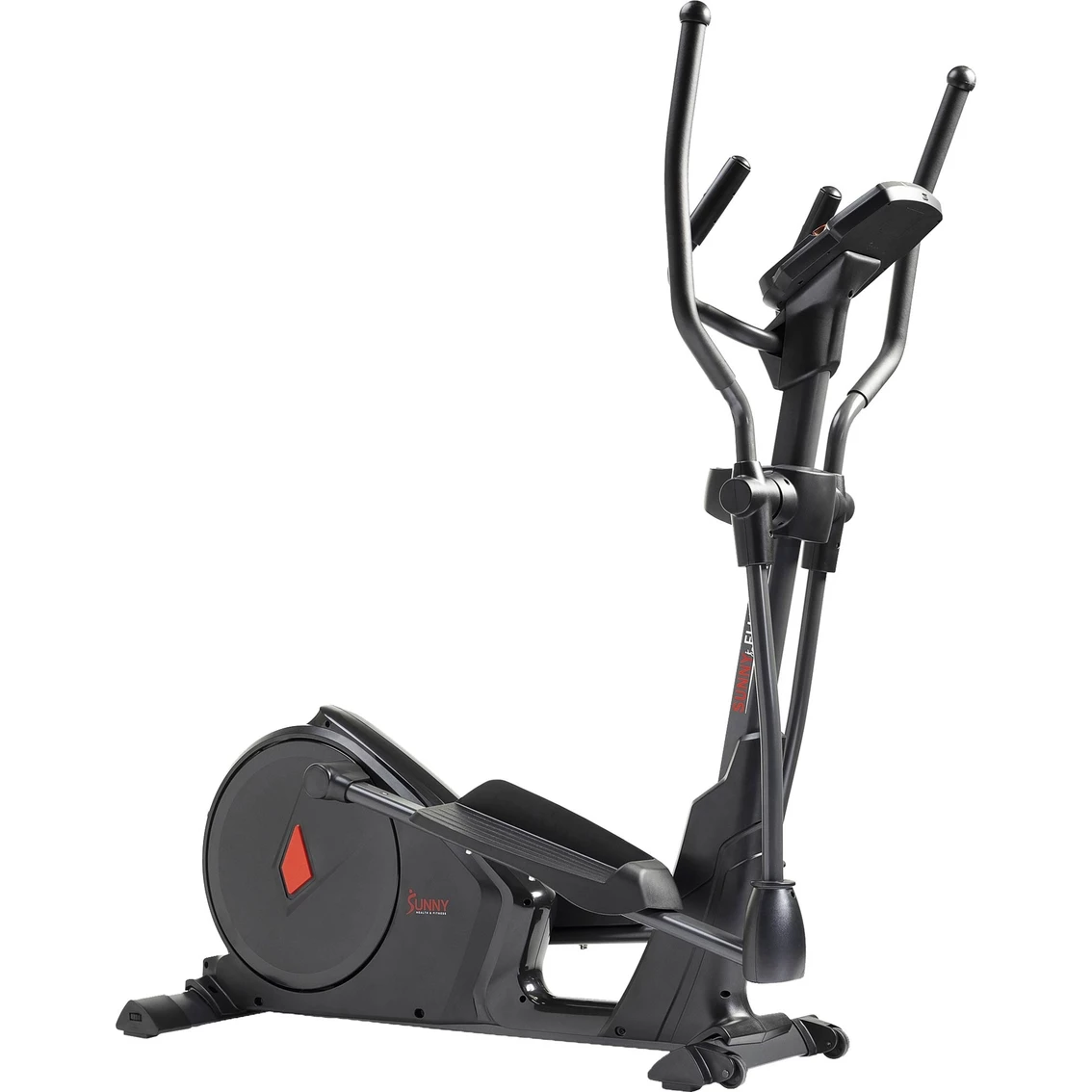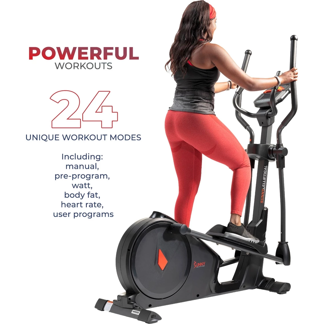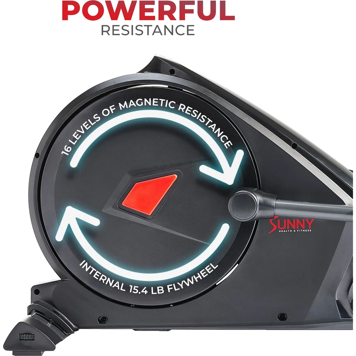 Pack a cardio workout in the comfort of your home with the Pre-Programmed Elliptical Trainer by Sunny Health and Fitness. Stride 15.5 inches when you step onto the wide and textured footplates. Grab onto the handlebars to engage muscles in your upper body and maintain balance during your exercises. Grip the pulse sensors to keep tabs on your heart rate as you stride. Alternatively, you can link a compatible wireless heart rate belt to this cardio trainer to take advantage of heart-rate targeted workout programs and features. Maintain stability on any ground surface when you adjust the front and rear stabilizers on this elliptical cross trainer. Control workout resistance when you increase and decrease the 16 levels of programmable magnetic resistance when the elliptical is plugged in to a power source (adapter included). Stride along with Sunny Health and Fitness expert trainers on the Sunny Health and Fitness SunnyFit APP. Connect your preferred mobile device through Bluetooth and view your performance metrics in real time. Model: SF-E3912SMART.