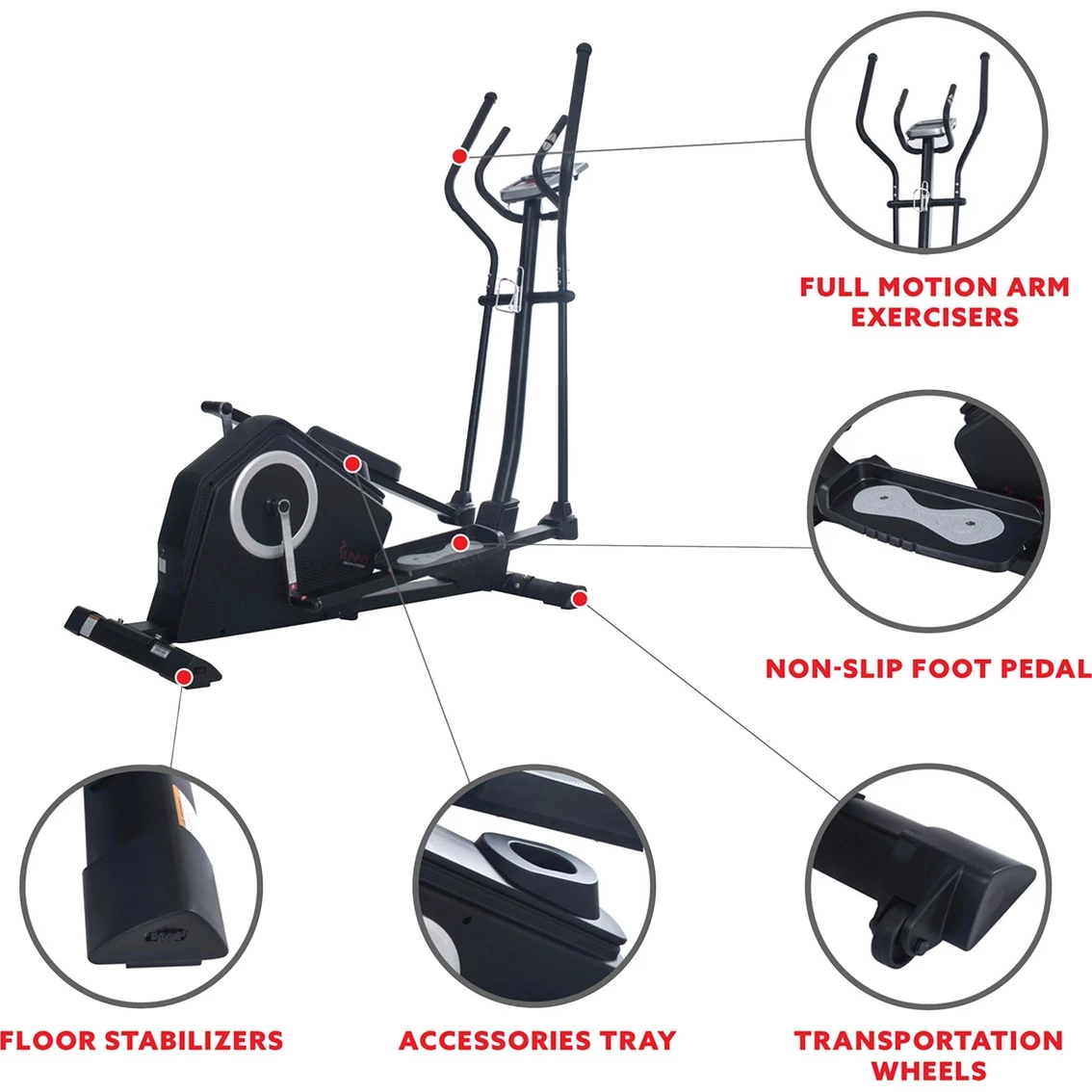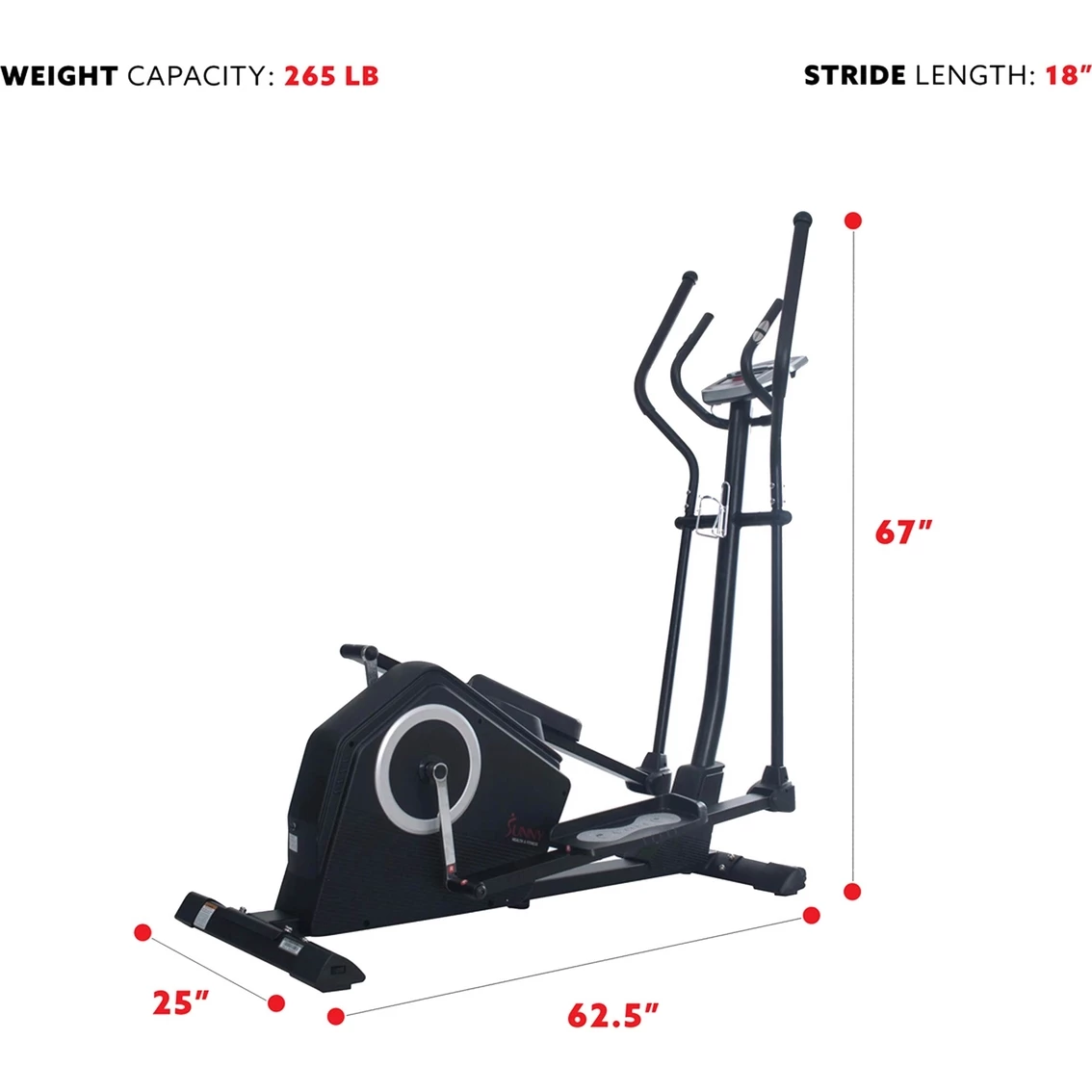 Stay ready for the challenge and push your fitness to the limits with the Sunny Health and Fitness Programmable Cardio Elliptical Trainer. The low-impact nature and function of this elliptical saves your joints from stress and wear while getting a total body workout. An advanced performance monitor keeps you informed every stride of the way. Use in conjunction with the 12 preloaded elliptical programs, this Cardio Elliptical Trainer will help you reach your fitness goals and beyond! Stay in sync with your workouts and track your fitness metrics such as Speed, RPM, Distance, Odometer, Calories, Watt, Heart Rate, Target Heart Rate, Program and Resistance Level. Preloaded programs will help you add variety and challenge to your elliptical workouts. Super charge your fitness with 16 levels of electronically controlled magnetic resistance. Model: SF-E3890.
