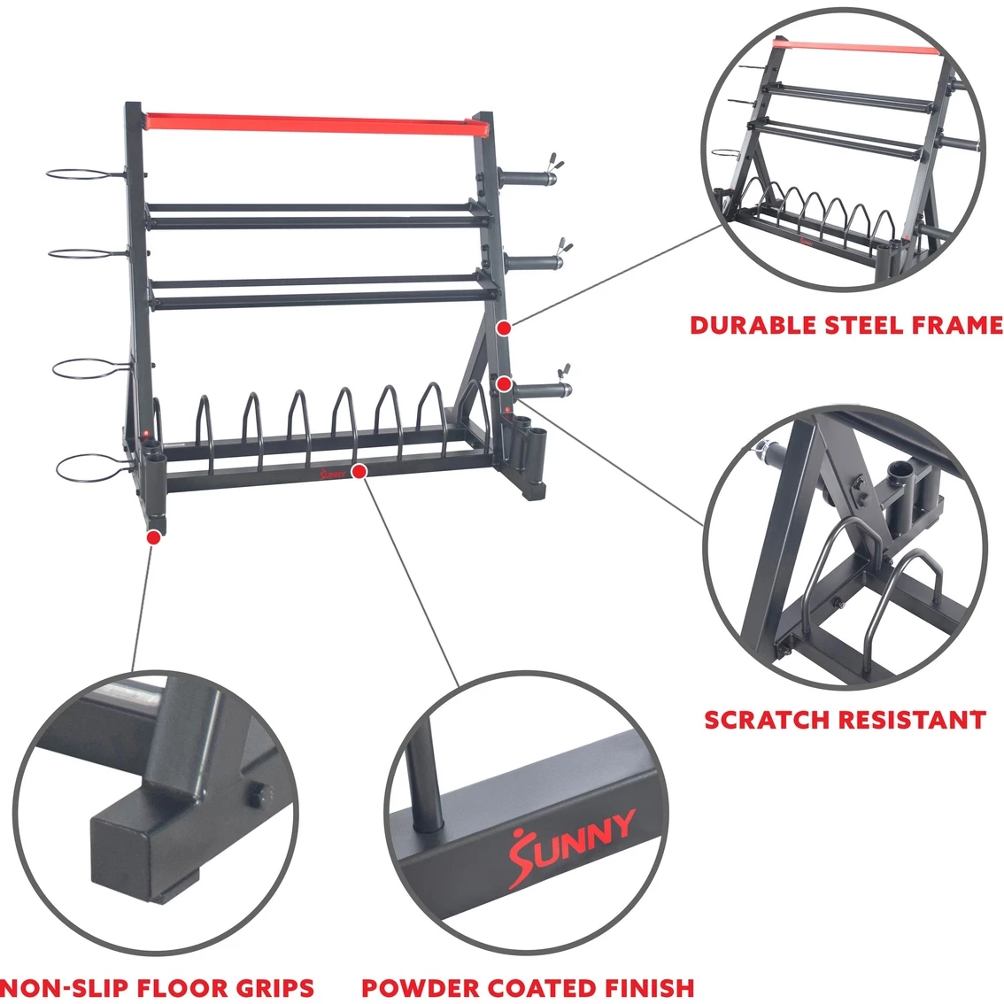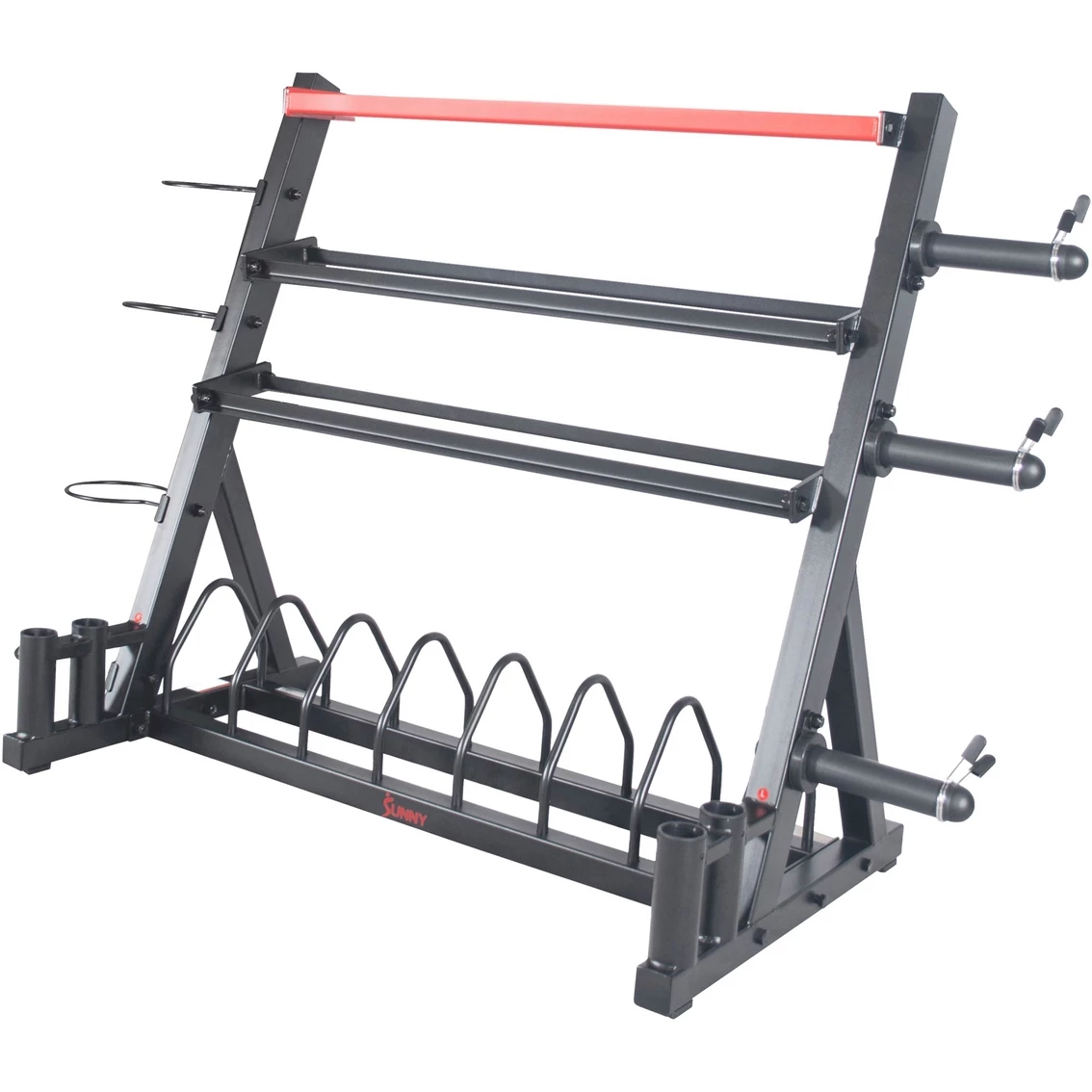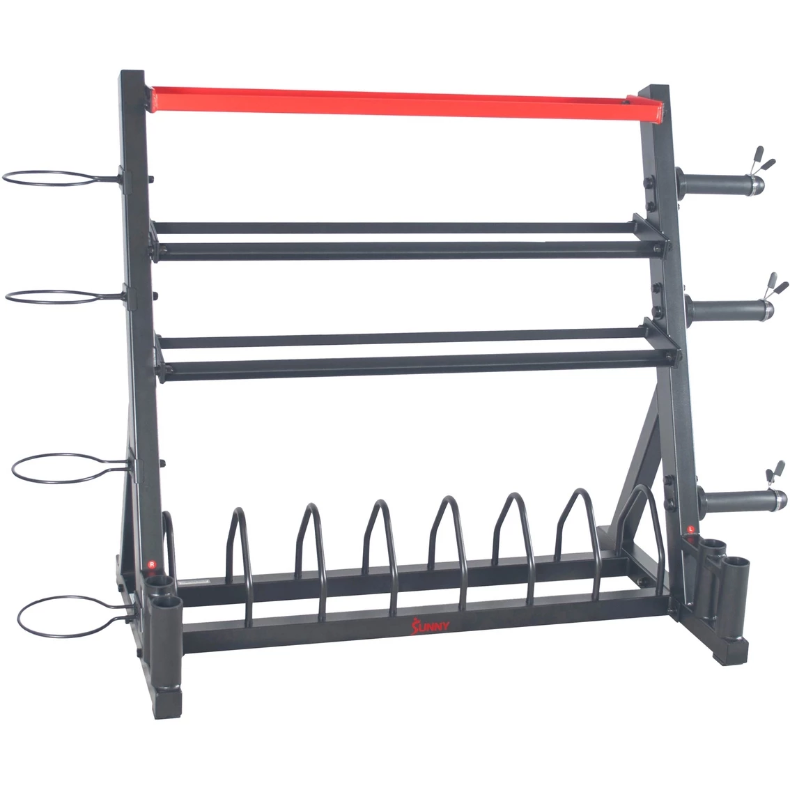 Get focused, organized, and on the right track for big gains with the Sunny Health & Fitness Multi-Weight Strength Training All-In-One Rack Stand. Capable of storing the most commonly used free weights and strength training equipment such as: weight plates, Olympic-sized barbells, kettlebells, dumbbells, and medicine balls. This weight rack is an exceptional addition to any home workout gym to help keep workouts, goals, and equipment aligned and coordinated.