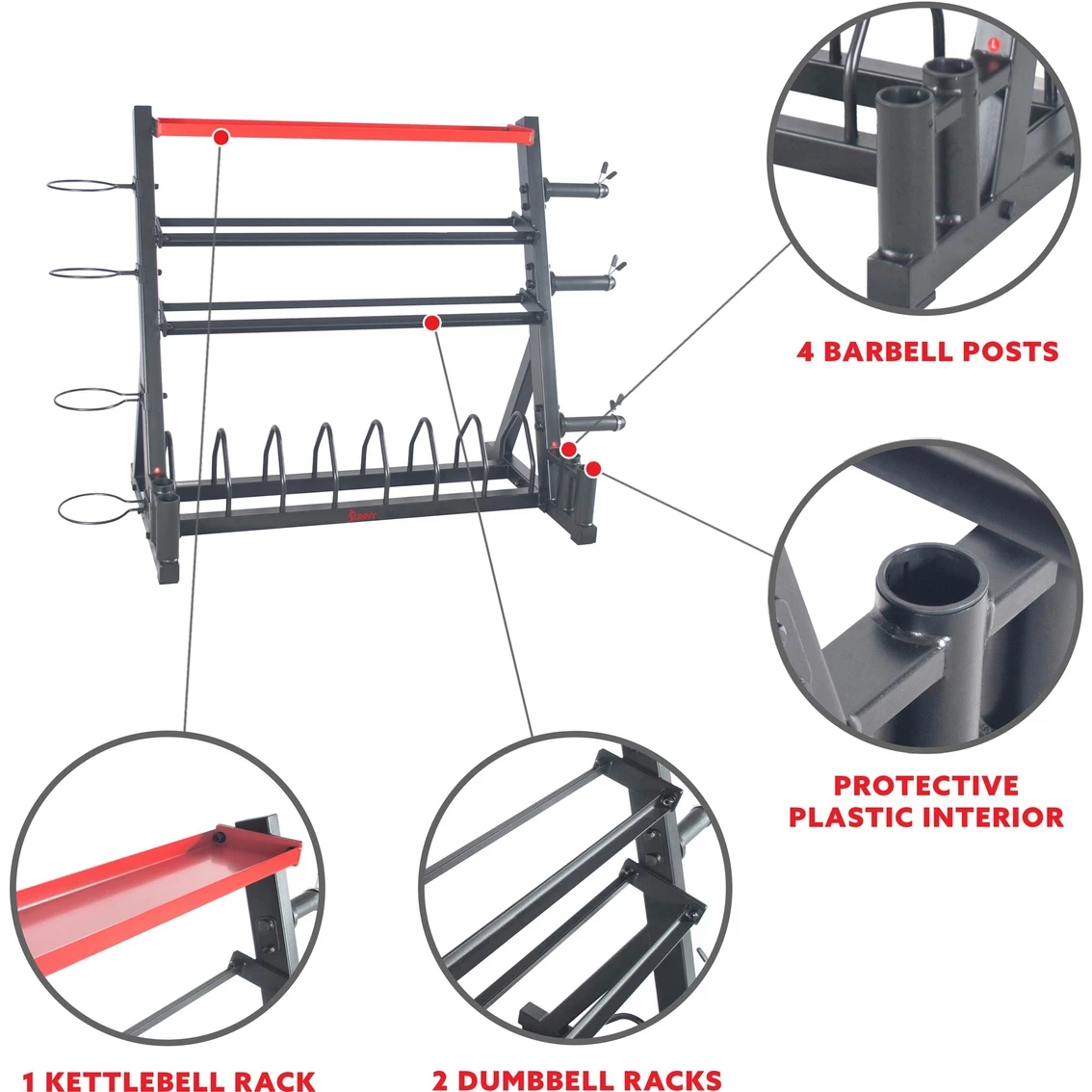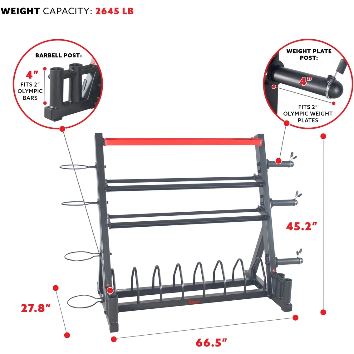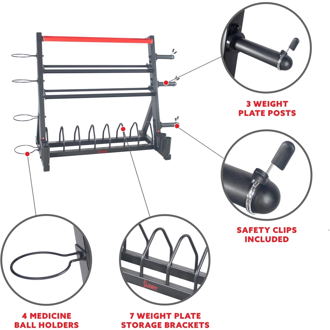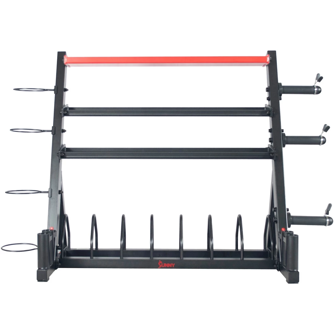 Get focused, organized, and on the right track for big gains with the Sunny Health & Fitness Multi-Weight Strength Training All-In-One Rack Stand. Capable of storing the most commonly used free weights and strength training equipment such as: weight plates, Olympic-sized barbells, kettlebells, dumbbells, and medicine balls. This weight rack is an exceptional addition to any home workout gym to help keep workouts, goals, and equipment aligned and coordinated.