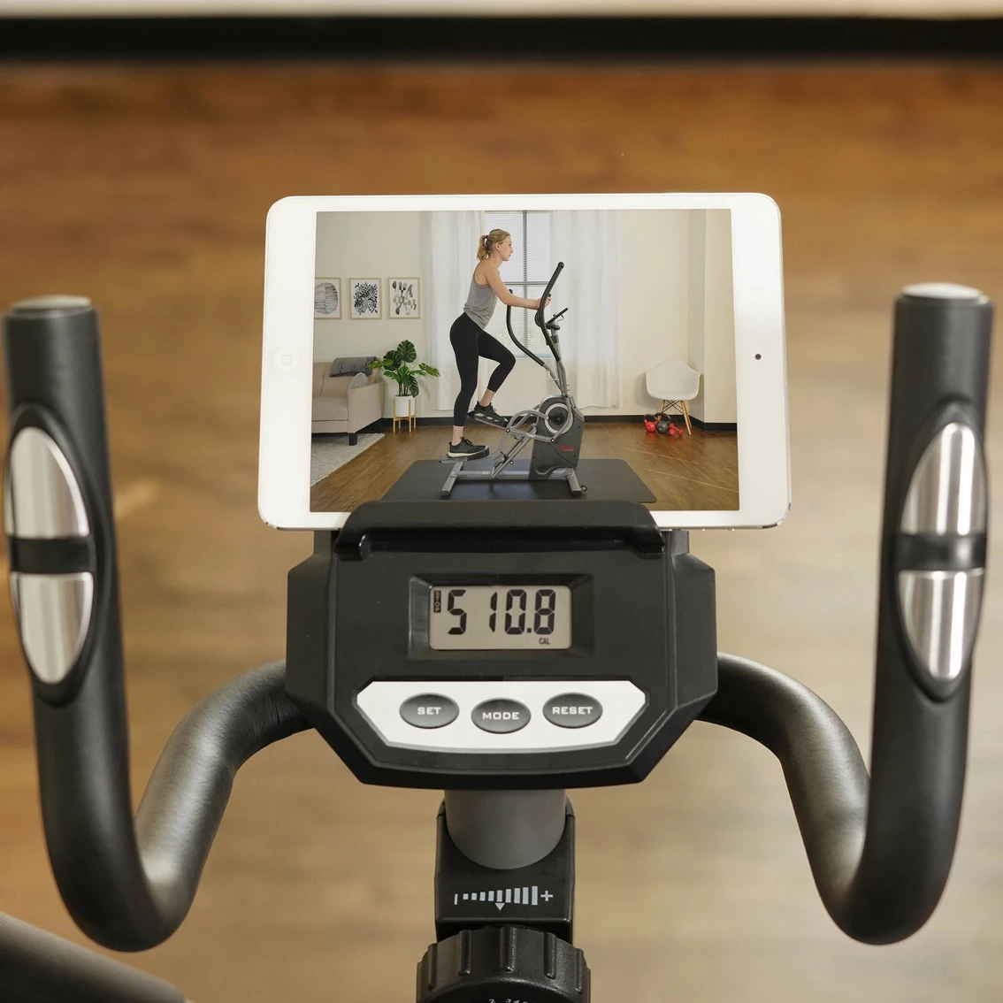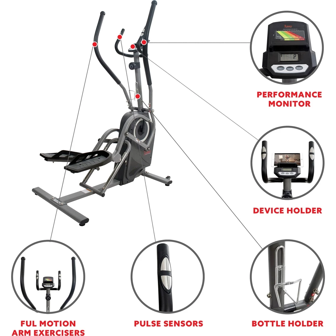 – Device Holder: Secure your mobile device onto the holder and follow along to your favorite Sunny Health & Fitness workout videos.