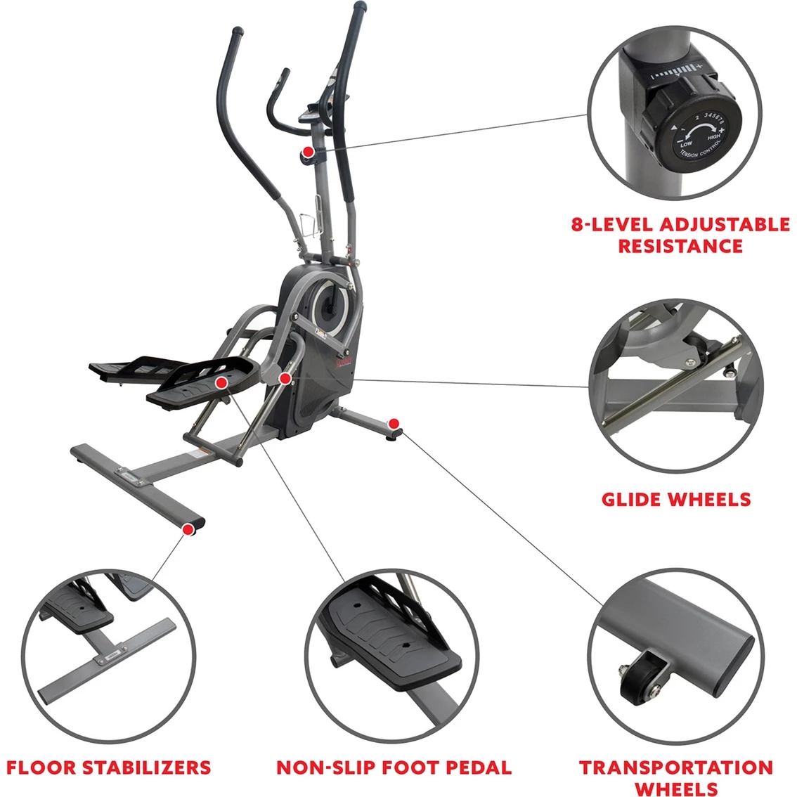 – Floor Stabilizers: Eliminate any wobbling and shakiness during your workouts by simply turning the floor stabilizers until level with your floor.