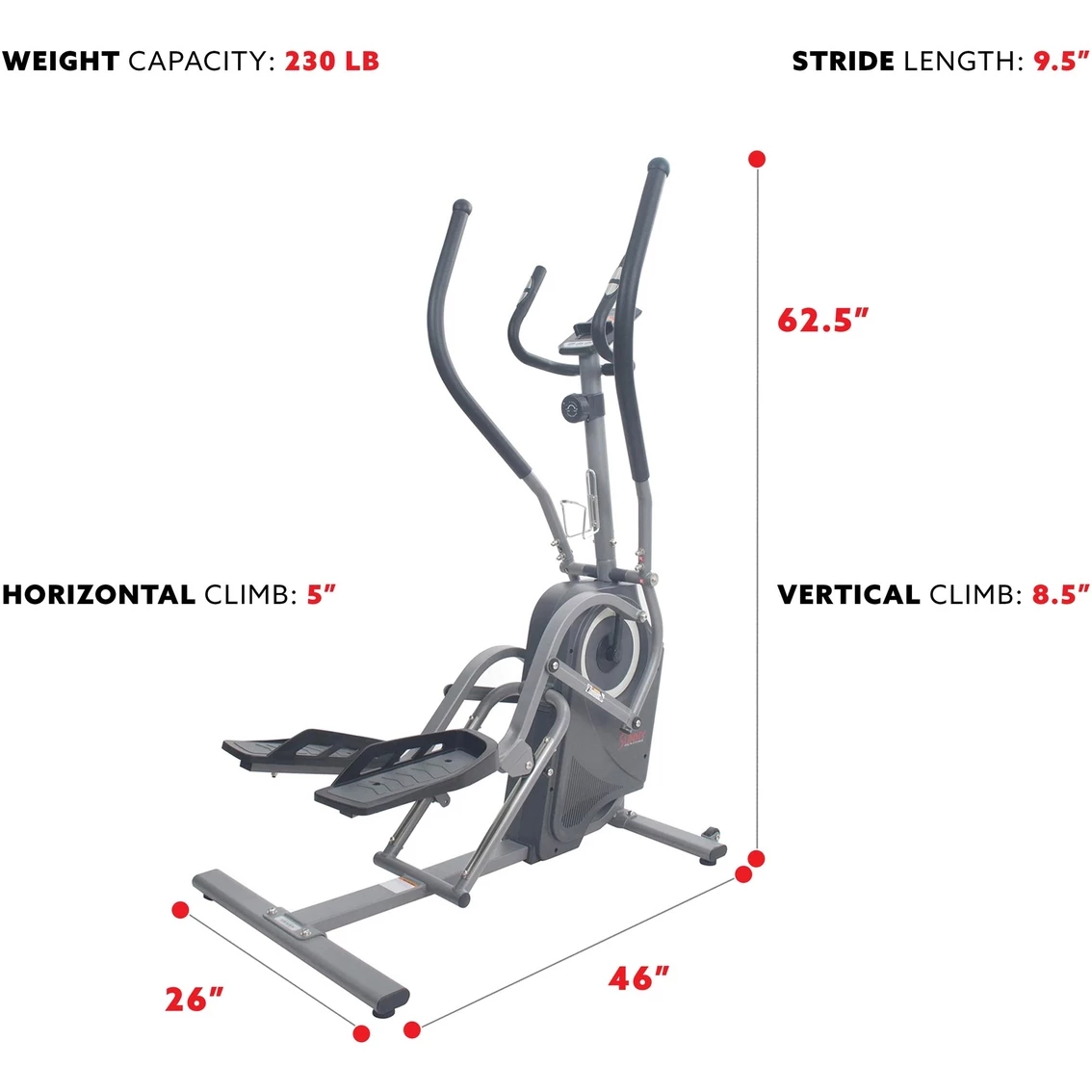 – Climbing Stride Motion: 8.5-in. vertical, 5-in. horizontal and 9.5-in. overall stride length creates a unique climbing motion that maximizes workout efficiency.