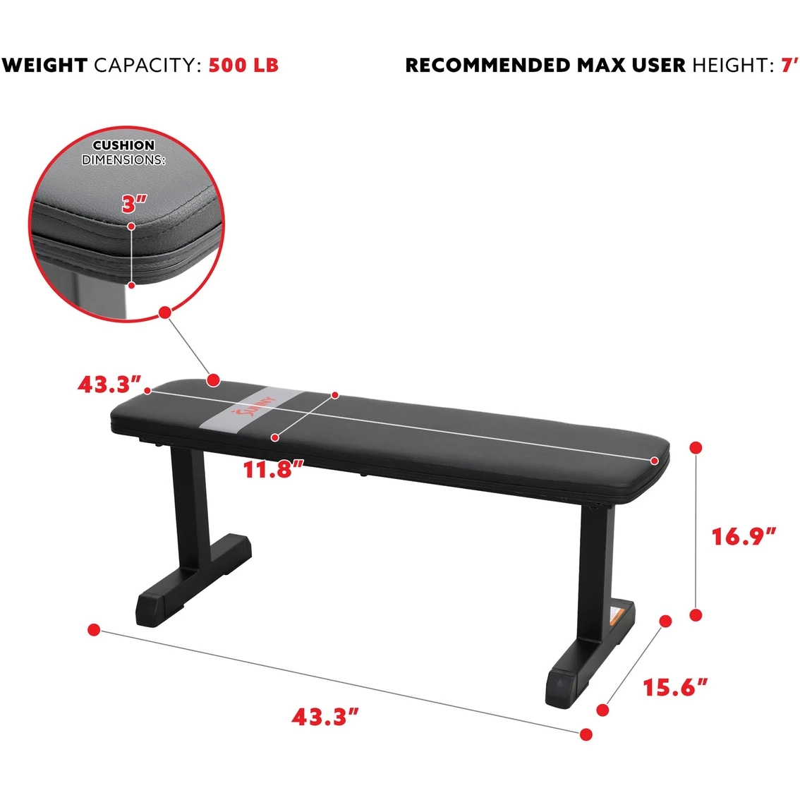 The Sunny Health & Fitness Flat Weight Bench (SF-BH620037) is a space-efficient and essential cornerstone for your strength training exercises and workouts. This versatile weight bench could be pair with several different types of equipment for a comprehensive total body home gym fitness experience. It features an incredible max weight of up to 500lb. so you can push your gains and workouts to their limit!