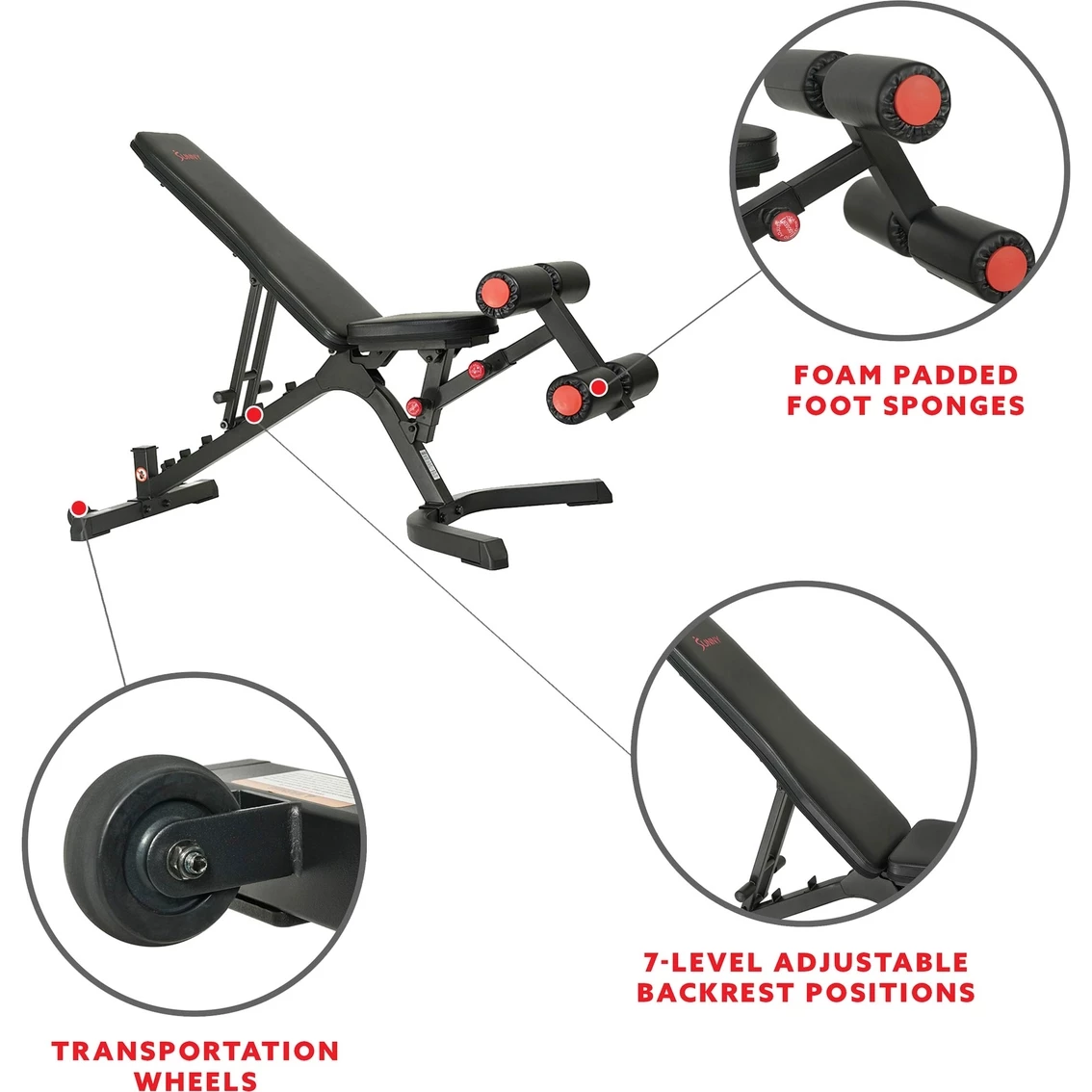 The Sunny Health & Fitness Powerzone Weight Bench Home Gym Equipment (SF-BH6920) provides you the ability to lift stretch and maximize your intense workouts. Tear/Wear-resistant PU upholstery wipes clean and supports you comfortably with eco-friendly foam through the most intense exercise sessions. Fully Adjustable Weight Bench 7 Positions(-20, 0, 15, 30, 45, 60, and 85 degrees).