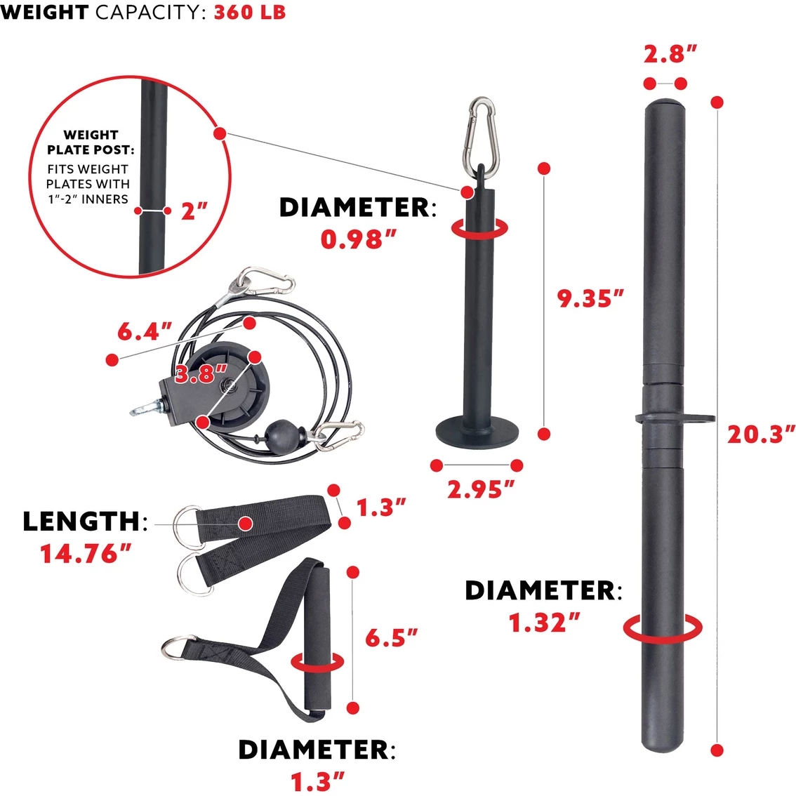 – Weight Plates: Fits weight plates with 1 – 2 in. inners for use in the pulley attachment.