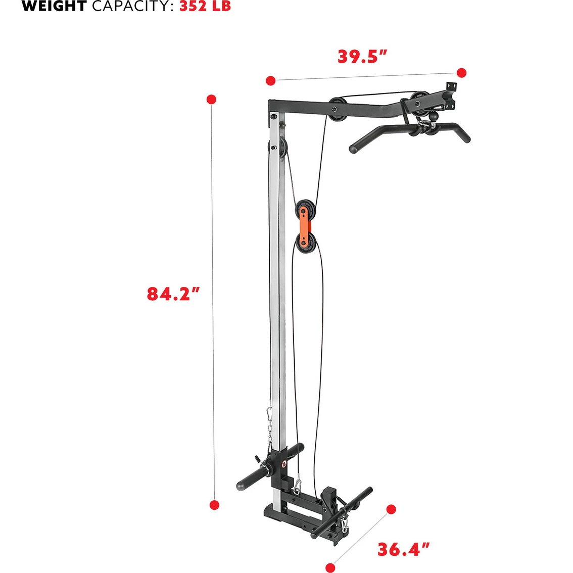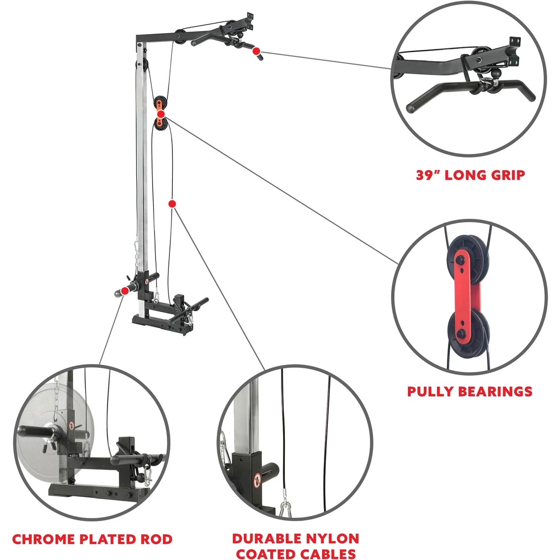 – Expert Engineering: Designed with safety and quality in mind, the Sunny Health & Fitness Lat Down Attachment Pulley System is constructed using 2 x 2 in. carbon square pipe and chrome-plated guide rods.