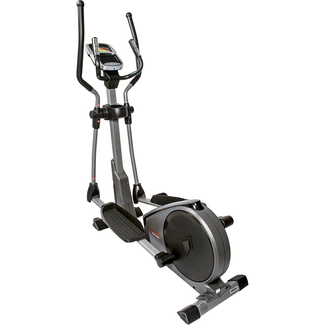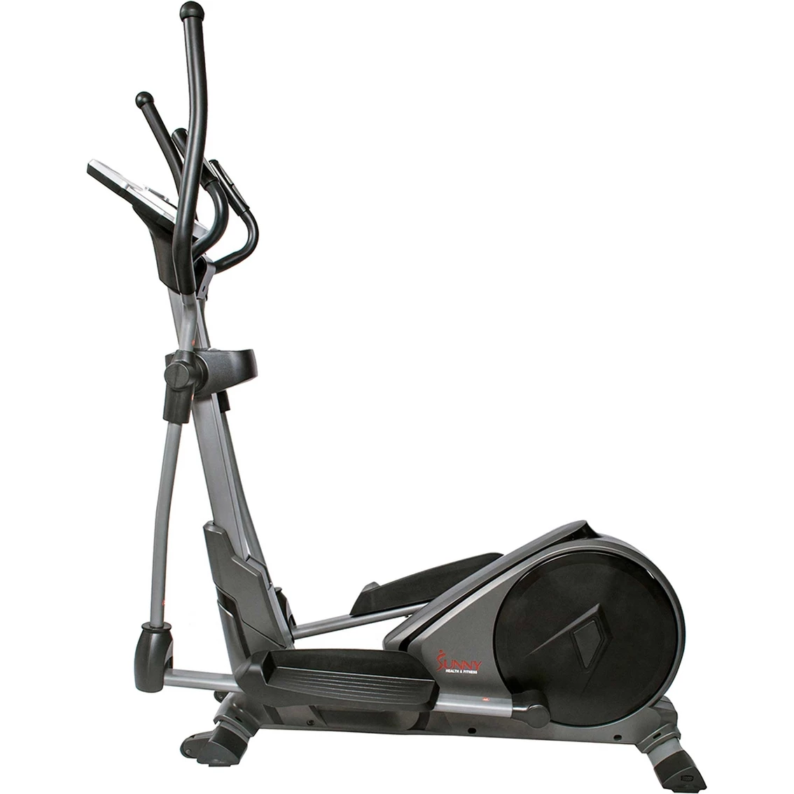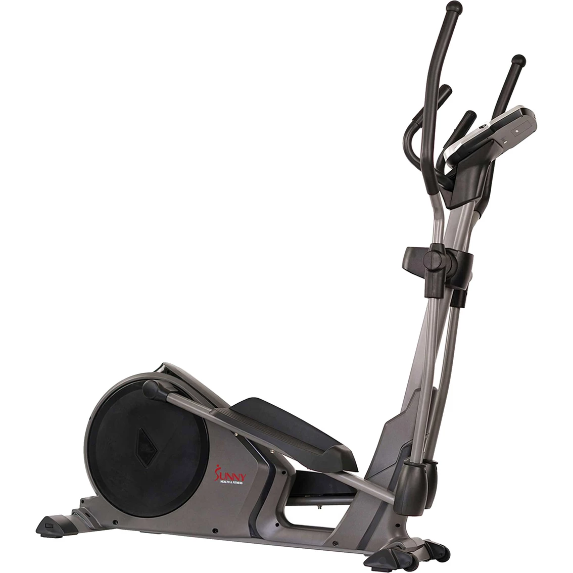 Pack a cardio workout in the comfort of your own home with the SF-E3912 Pre-Programmed Elliptical Trainer by Sunny Health & Fitness. Stride 15.5 inches when you step onto the wide and textured footplates. Grab onto the handlebars to engage muscles in your upper body and to maintain balance during your exercise. Hold onto the pulse grips to keep tabs on your heart rate as you stride. Alternatively, you can link a compatible wireless heart rate belt to this cardio trainer to take advantage of heart-rate targeted workout programs and features. Maintain stability on any ground surface when you adjust the front and rear stabilizers on this elliptical cross trainer. Control workout resistance when you increase and decrease the 16 levels of programmable magnetic resistance when the elliptical is plugged into a power source (adapter included). Track your speed, time, distance, calories burned, rotations per minute, watt generation, heart rate, and computer-controlled resistance on one backlit LCD. Take advantage of 24 target-specific, pre-programed, and custom workout profiles. Use the recovery function to track how well your heart level returns to normal after you exercise. Activate the body-fat program to tailor elliptical workouts to your specific BMI. Designed for challenging workouts, this magnetic elliptical machine has a 330 lb. weight capacity. Use the bottle holder to place your favorite hydrating beverage in arm’s reach. After you workout, move this home-use elliptical trainer from room to room with ease by using the front-loaded transportation wheels. Assembled Dimensions: 62.6L x 29.3W x 47.6H inches. Folded Dimensions: 62.6L x 29.3W x 8.3H inches. Assembled Weight: 117.9 lbs. Model: SF-E3912.