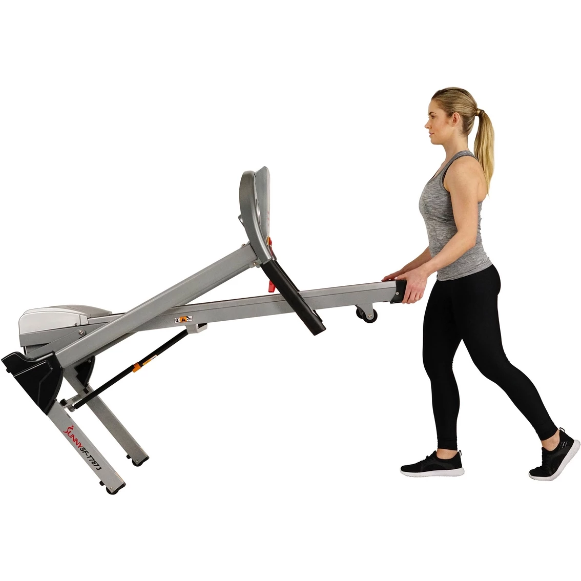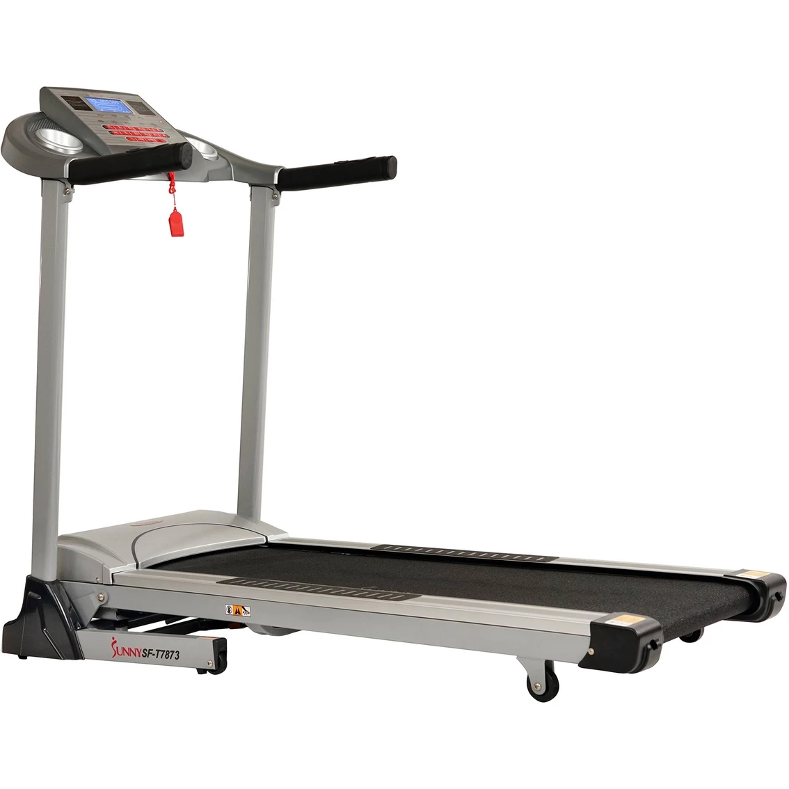 Tackle new fitness challenges with the Treadmill with Auto Incline by Sunny Health & Fitness. Run on the shock absorption-equipped (52.5 L x 16 W) treadmill deck that is designed to reduce impact on knees when you walk and run. Enjoy the 2.5-peak horsepower motor, which supports speeds between 0.6 mph and 11 mph. Increase your workout intensity in a flash by adjusting automatic incline up to 15 percent. Designed for both intense running and endurance-driven walking sessions, this machine has a weight capacity of 285 lb. Grab the handrail-equipped heart rate monitors to conveniently track your pulse during your exercise. Monitor your workout on the 5-inch performance display. Keep track of your speed, time, distance (both miles and kilometers), incline, calories burned, and heart rate. Mix up your workout with 9 user programs. And take advantage of the body fat calculator to mix up your workouts. Attach a wireless 5.3KHz heart rate chest strap (not included) to activate a customized running program. This program adjusts your running speed based on your age and optimal heart rate range to keep your heart pumping at a calorie-burning level. Make quick adjustments to speed and incline with the easy console controls or the handrail controls. Play your music through the loud speakers on the treadmill by connecting your favorite music player to the indoor treadmill via the 3.5mm audio port. Fold the treadmill deck upward to save space after your workout. Take advantage of the soft-drop technology that prevents crashes when coming down. Use the onboard transportation wheels to easily move this machine from room to room. Model: SF-T7873.