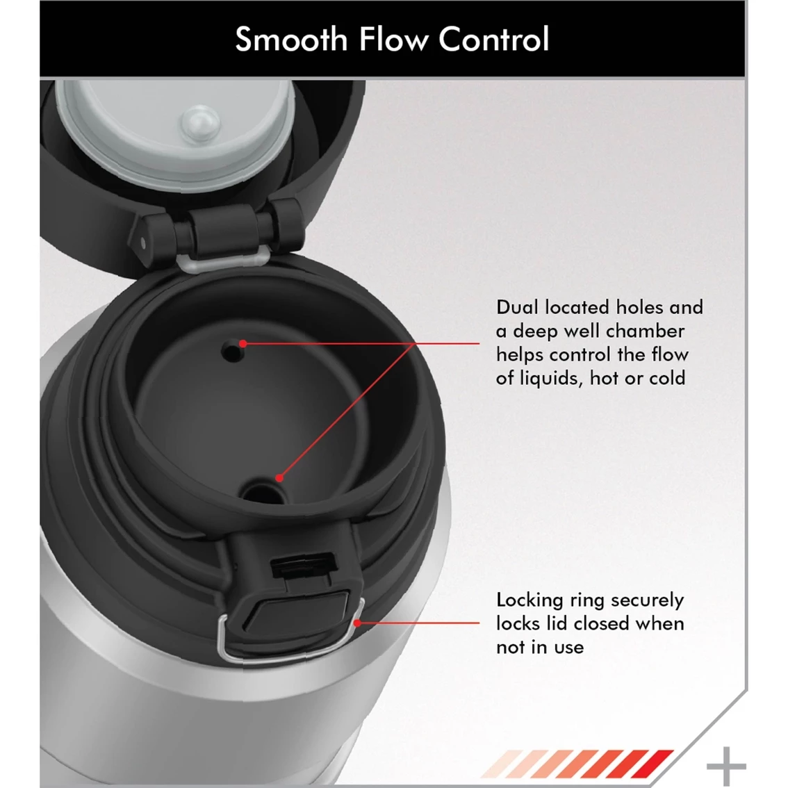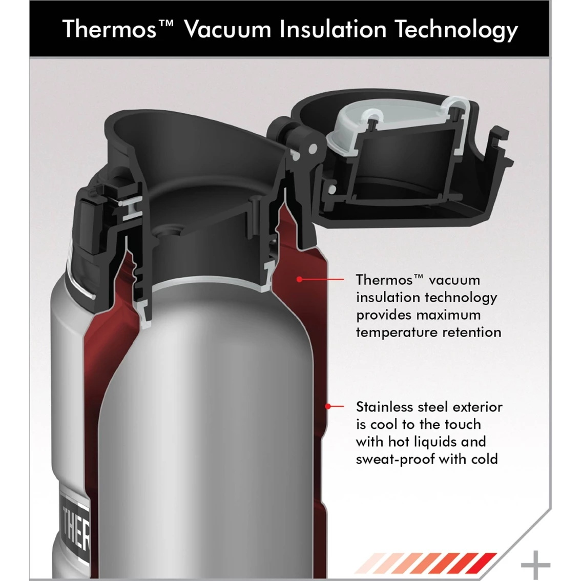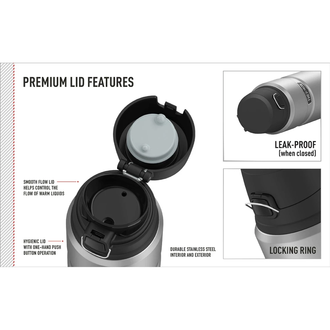 The Thermos 24 oz. Stainless King Drink Bottle is a must-have for camping and outdoor enthusiasts. It has enough volume for the whole campsite, plus vacuum insulation technology to keep drinks hot for 18 hours and cold for 24. The smooth flow lid helps control the flow of liquids. The lid also has a push button with locking ring that helps the lid stay leak-proof when locked closed. Model: SK4000MSTRI4.