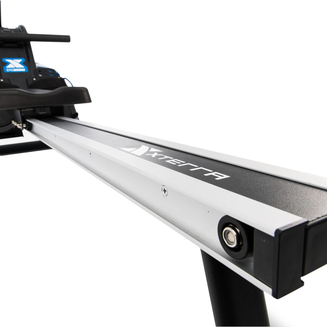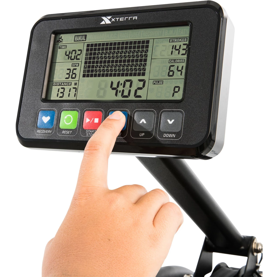 The large and easy to read 5.5 in. LCD console with height and angle adjustment includes motivating programmable modes to keep you involved, inspired, and reaching your goals. Performance is top-of-the-class with a smooth action dual aluminum rail system, convenient stand up design for storage, industrial strength handle strap, flex pedals with easy numbered adjustments, and durable XTERRA multi-bladed impeller for a water rowing experience second to none.