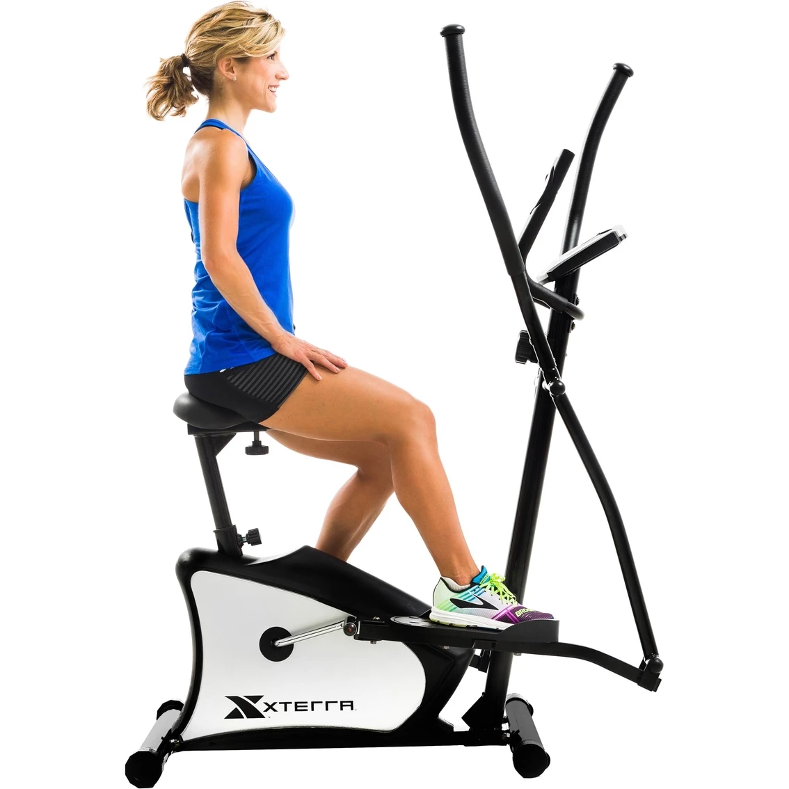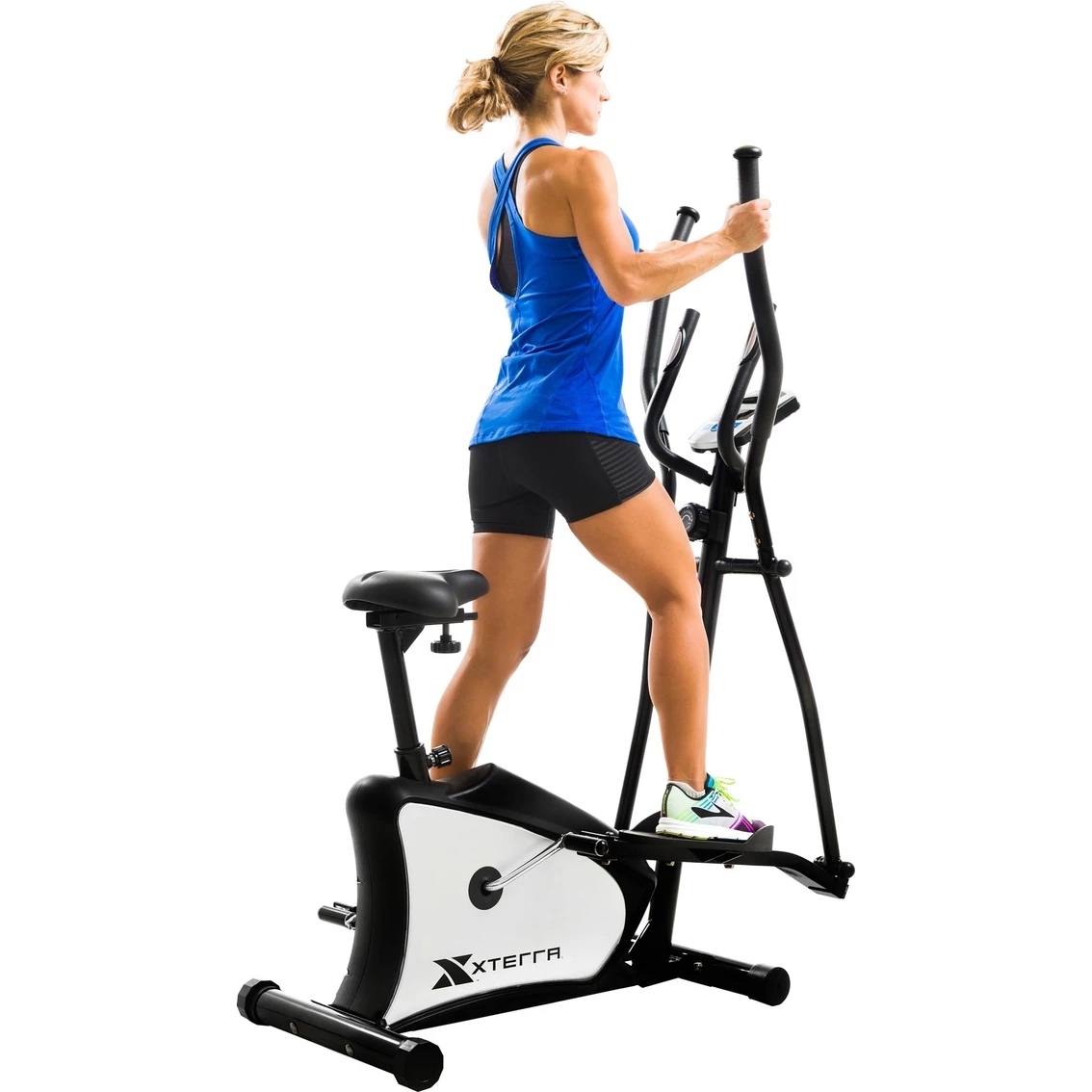 Looking for a comfortable and effective workout for your home? The EU100 Hybrid Elliptical/Upright Bike from XTERRA Fitness combines a smooth, non-impact, total-body elliptical workout with the seated comfort of an upright bike. Simply stand on the pedals to experience the elliptical trainer with a 13 in. stride length, 11 lb. flywheel, belt drive system and friction-free magnetic resistance. By sitting, you can change the intensity of your workout and target alternate muscle groups. This 2-in-1 combo workout combines two great pieces of equipment into one.