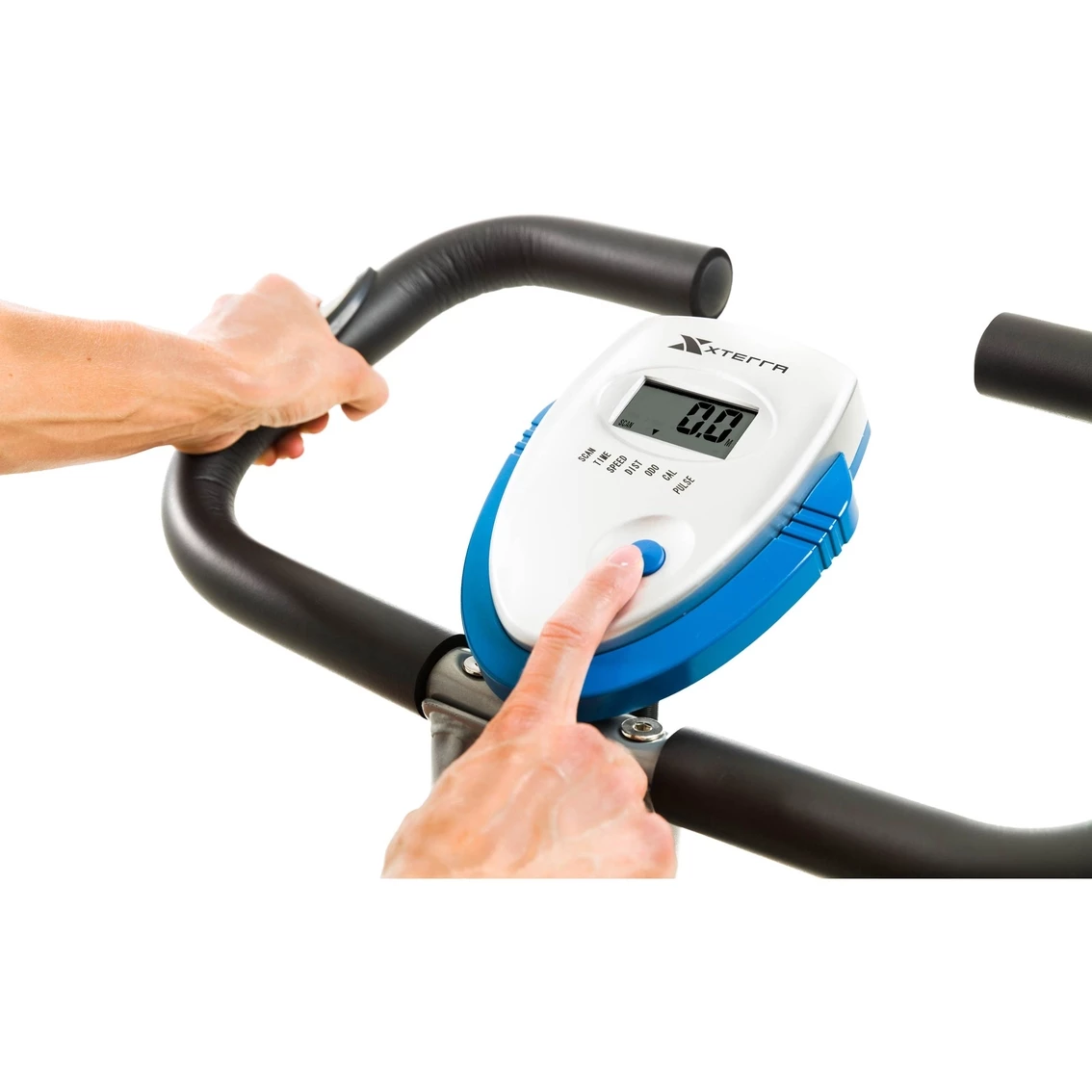 The advanced folding frame design and multi-seating positions of the FB350 Folding Bike from XTERRA Fitness maximizes your use of space while providing a workout that is comfortable and effective. With folded dimensions of only 20.5 in. x 20 in. and built-in transport wheels, it allows you to store it away when not in use and free up some valuable floor space.
