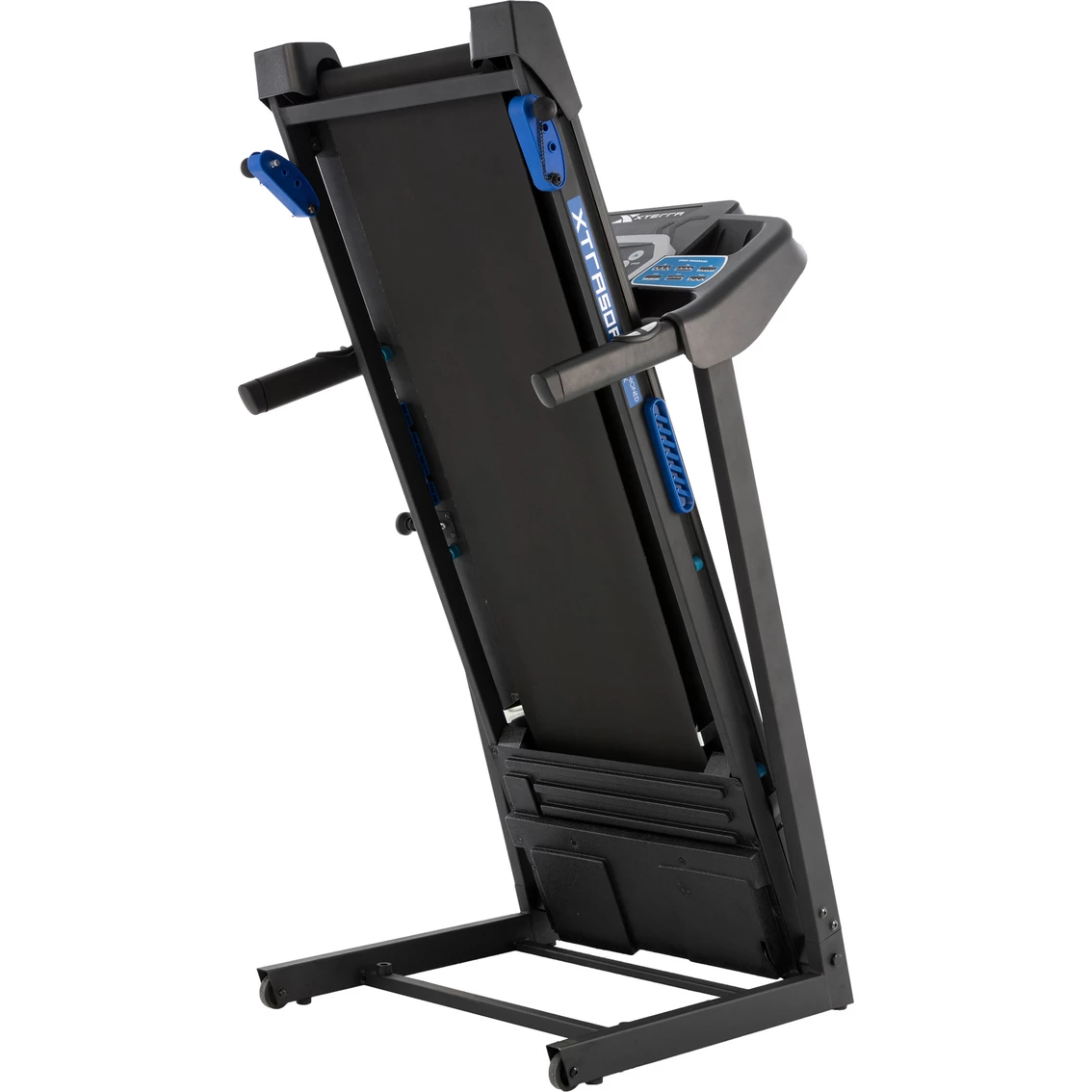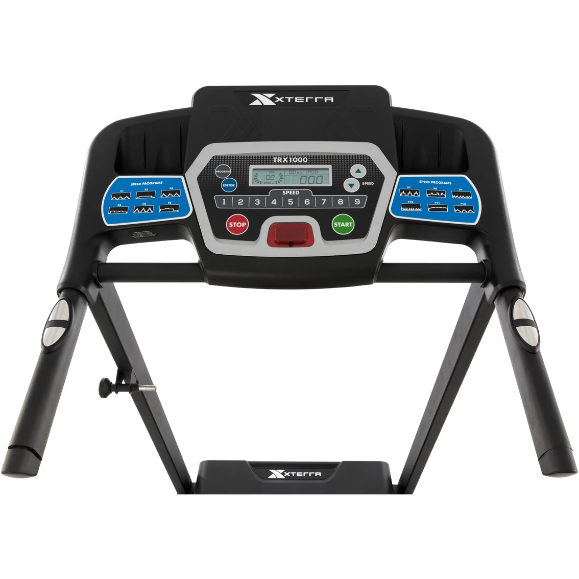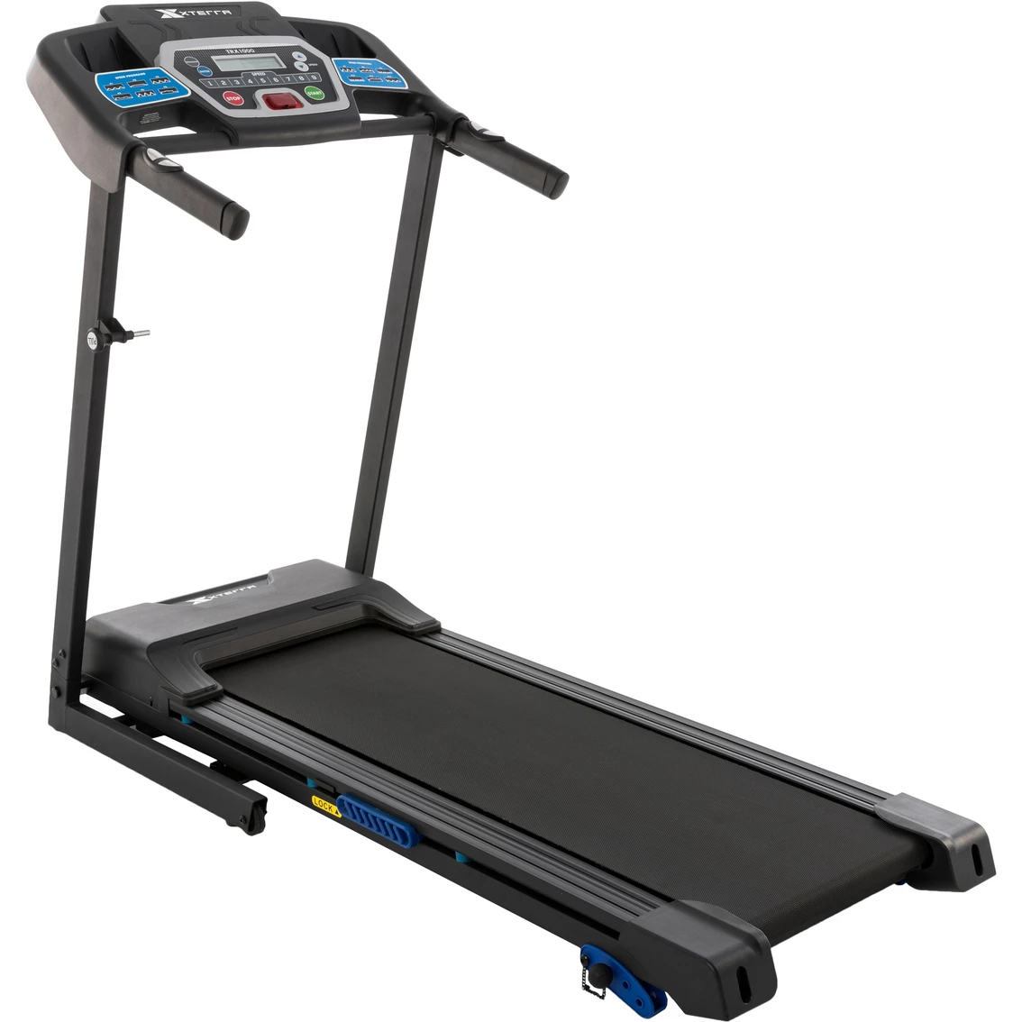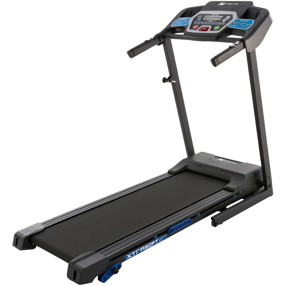 The smooth and quiet 2.25HP motor of the XTERRA TRX1000 delivers a heart-pounding speed range up to 10 mph, while the 3 manual incline settings allow you to push your limits. With 12 preset programs you get ultimate workout variety to keep challenging yourself and hit your personal training goals. The large 16 x 50 in. running surface combined with an XTRA Soft cushioned deck design enables you to take long comfortable strides while minimizing impact on knees and joints. When your workout is finished, the XTERRA Fitness TRX1000 easily folds up and rolls into storage thanks to the built-in transportation wheels. Model: 100819.