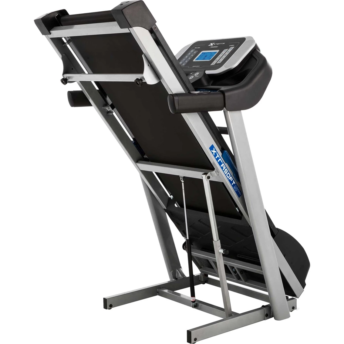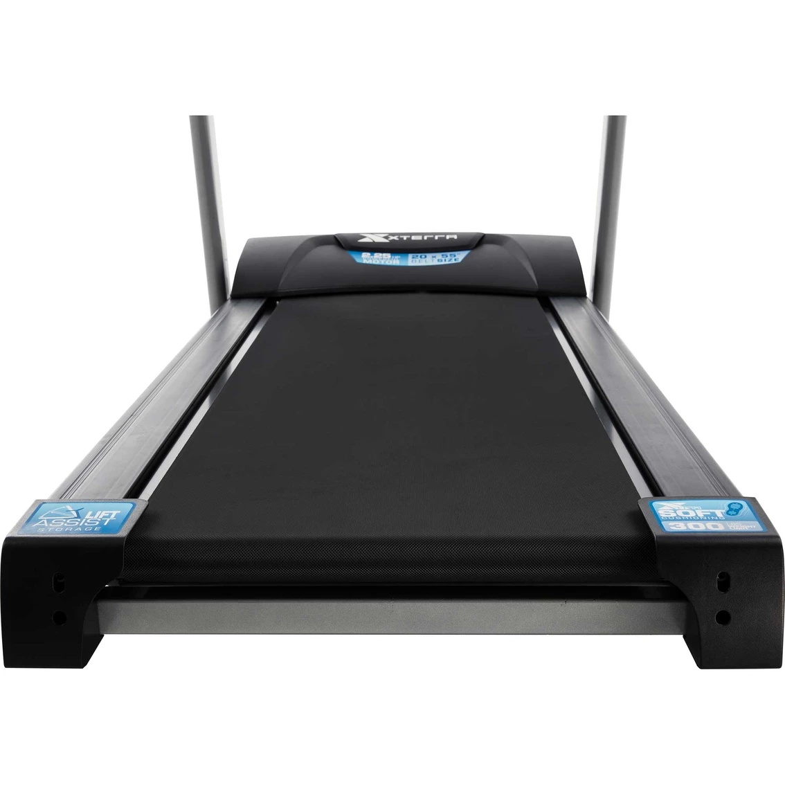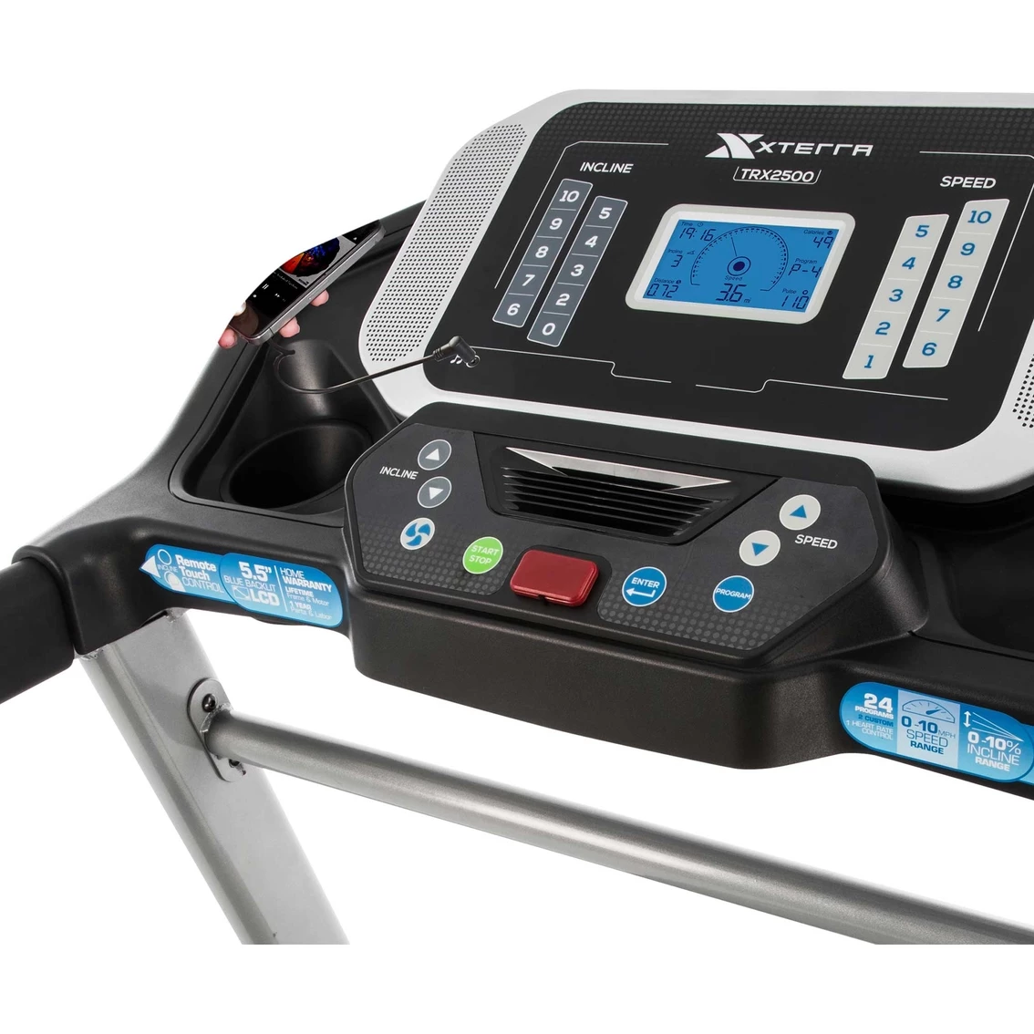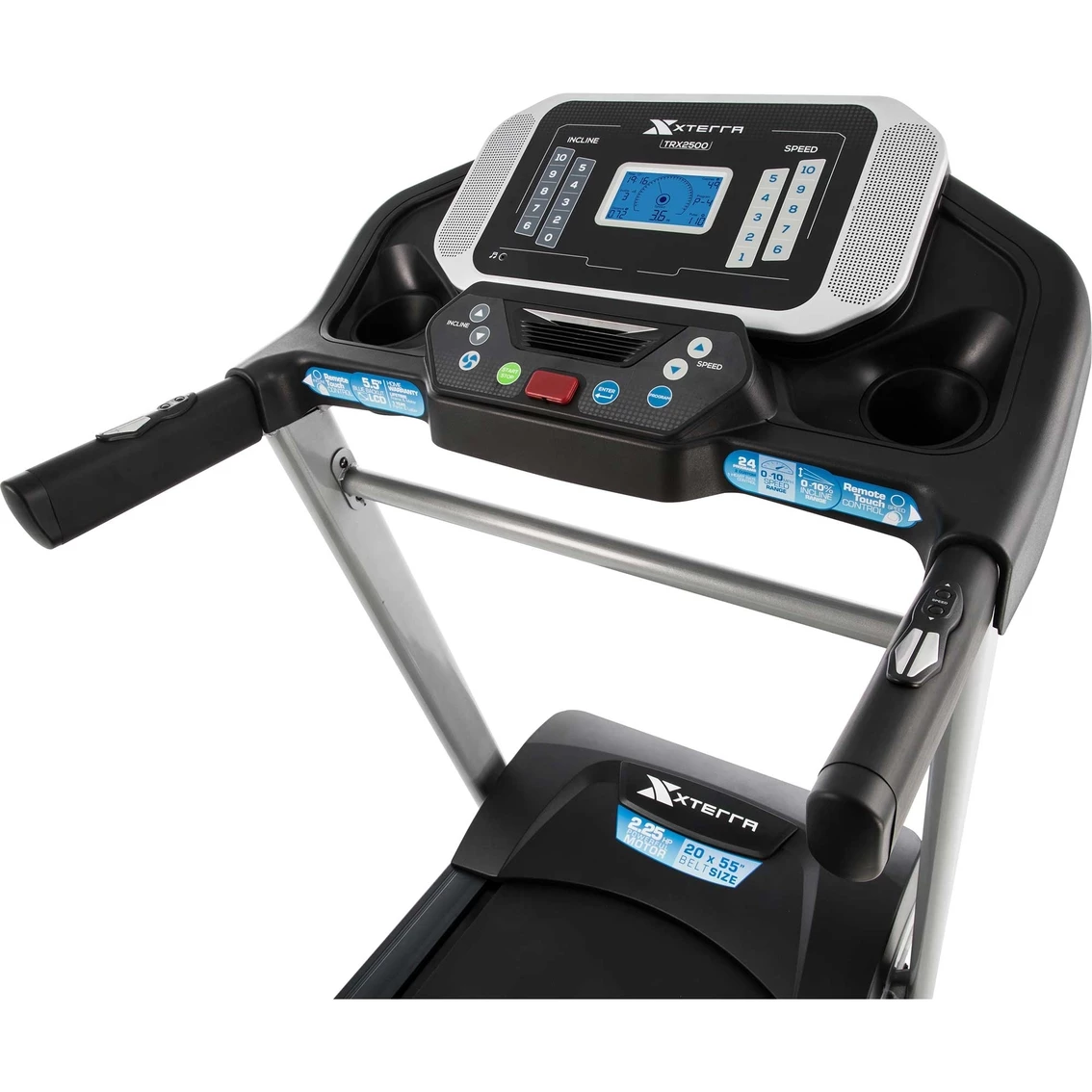 Start down the road to the best shape of your life with the XTERRA Fitness TRX2500 treadmill. The console display features an easy to read large 5.5 in. Blue Backlit LCD display with 24 preset programs for users of all fitness levels. Other convenient features include the quick access speed and incline buttons for quick workout changes, convenient handlebar controls for both speed and incline, speakers for your favorite tunes, and a cooling fan to keep you cool.